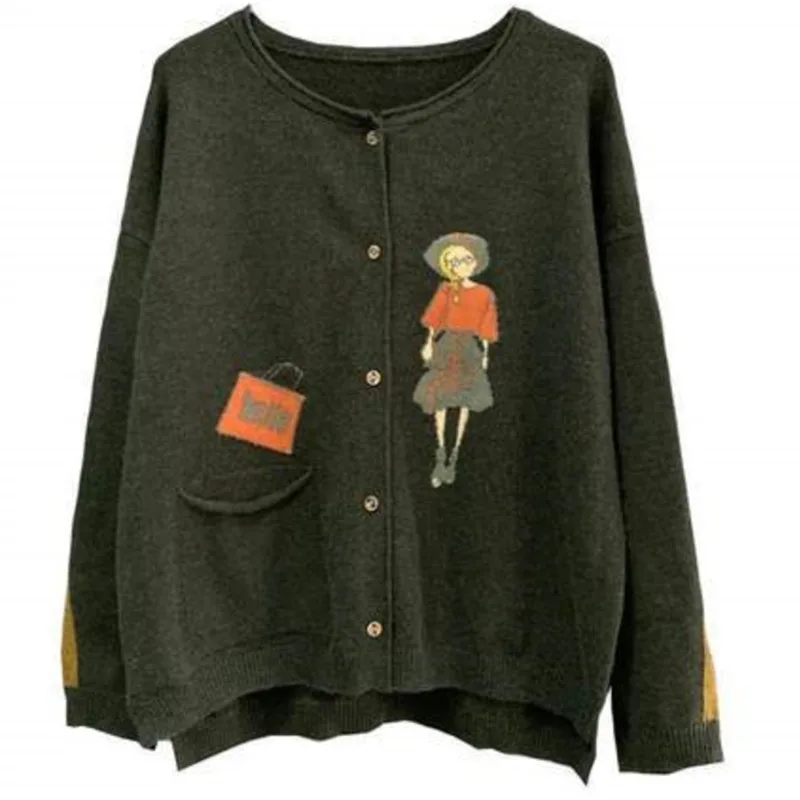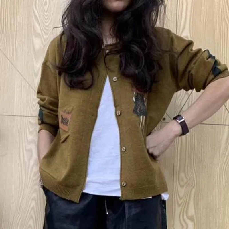 Корейский Свободный винтажный свитер, женский кардиган, повседневный Модный яркий дизайнерский Тонкий однобортный Кардиган с круглым вырезом, топы