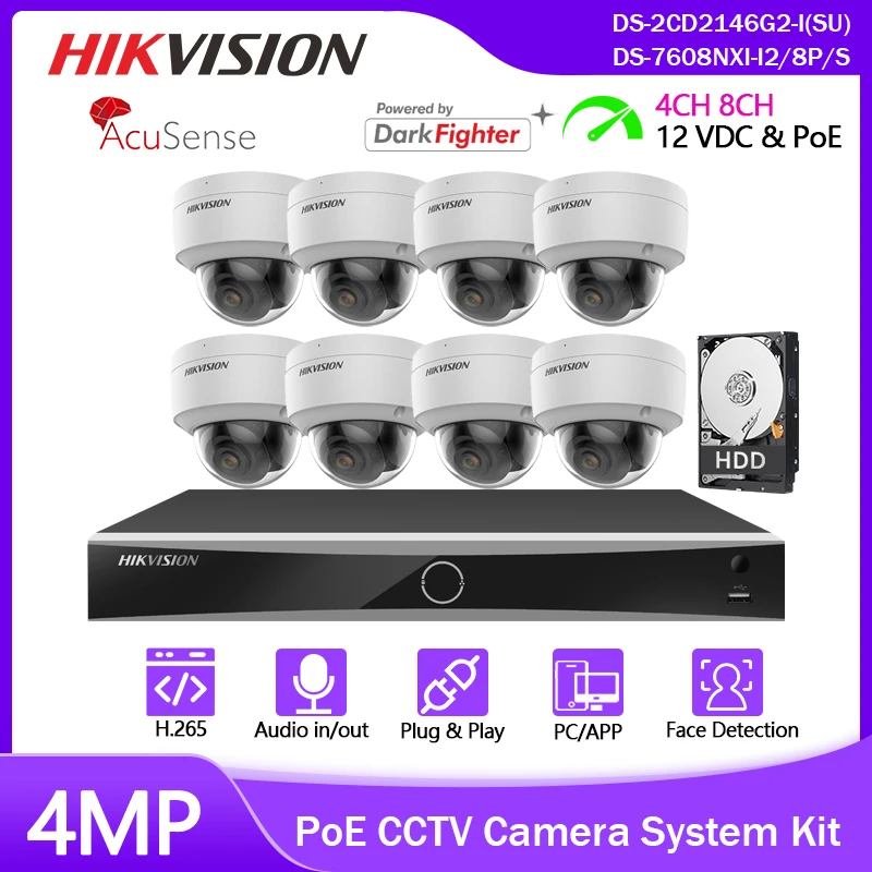 Hikvision Acusense 4-канальная 8-канальная IP-камера, наружная система видеонаблюдения, 4-мегапиксельная стандартная (SU) видеокамера с питанием по POE8 шт.с, аудиовеб-камера