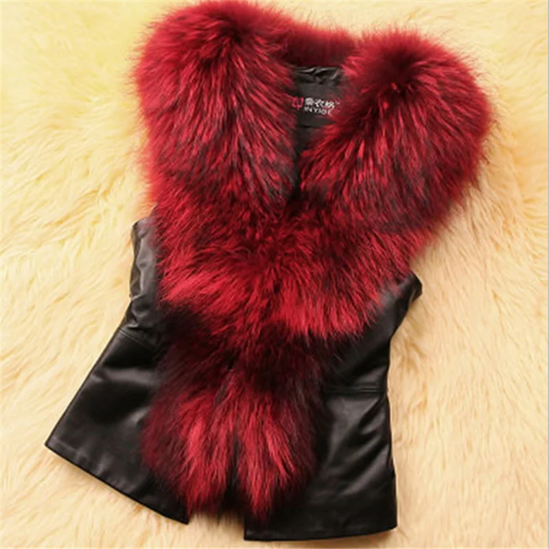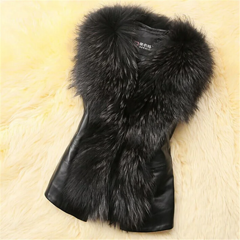 Жилет из искусственного лисьего меха на воротнике, женский кожаный ...