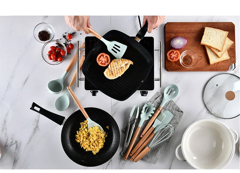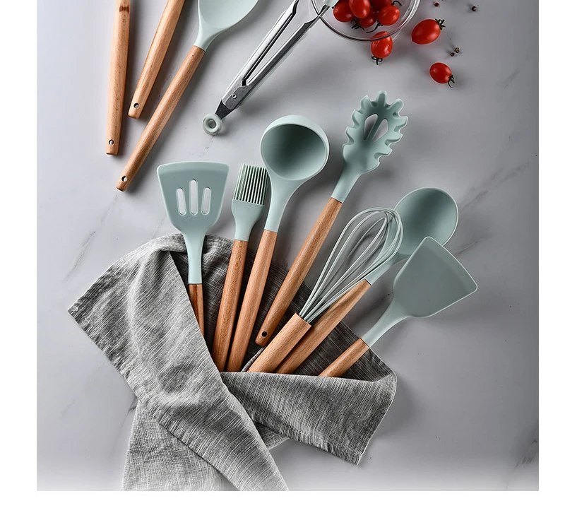 Зеленая силиконовая кухонная утварь, инструмент, аксессуары, антипригарный набор кухонных кастрюль, лопатка, ковш, измельчитель яиц, лопатка, кухонная посуда