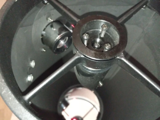 Неплохой коллиматор, с задачей справляется. Немного сбита соосность луча и посадочной поверхности. При вращении коллиматора в зафиксированной втулке лазерное пятно описывает окружность диаметром примерно 2см на расстоянии около 5м, но при расположении в окулярном узле мишенью в сторону главного зеркала из-за небольшого люфта при поджатии лазер бьет соосно втулке фокусера. Так же немного огорчило отсутствие батарейке в комплекте