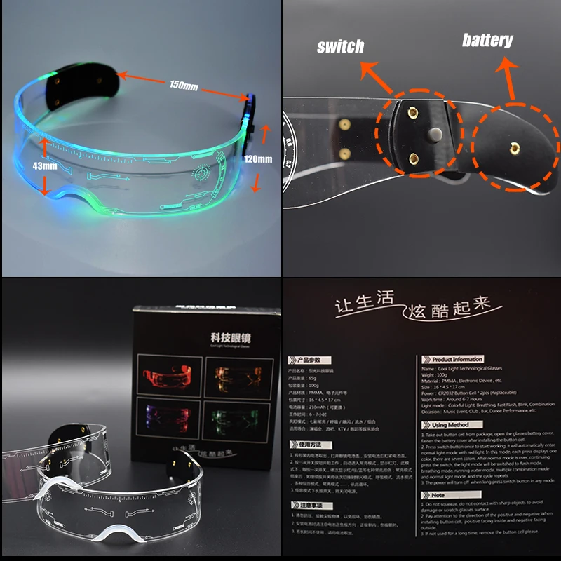 1, обратите внимание: это, безусловно, привлекательные очки, которые привлекут внимание на события, вечерние, карнавал или клуб. 2. Прочные материалы: высококачественные материалы для устойчивости к царапинам и высокой устойчивости к поломке. Использует беспроводной и бесшумный светодиодный технологии. 3. Комфорт при ношении: при проектировании очков мы сделали комфорт при ношении приоритетным. Дополнительная подкладка линз и формованные носоупоры делают вас комфортными. 4, два светодиода на каждой руке: расположение двух светодиодов на каждой руке делает его идеальной поддержкой для cyberpunk look. Они излучают светильник от объектива. 5, подходит для всех случаев: используется для ролевых игр, вечеринок и всех случаев.