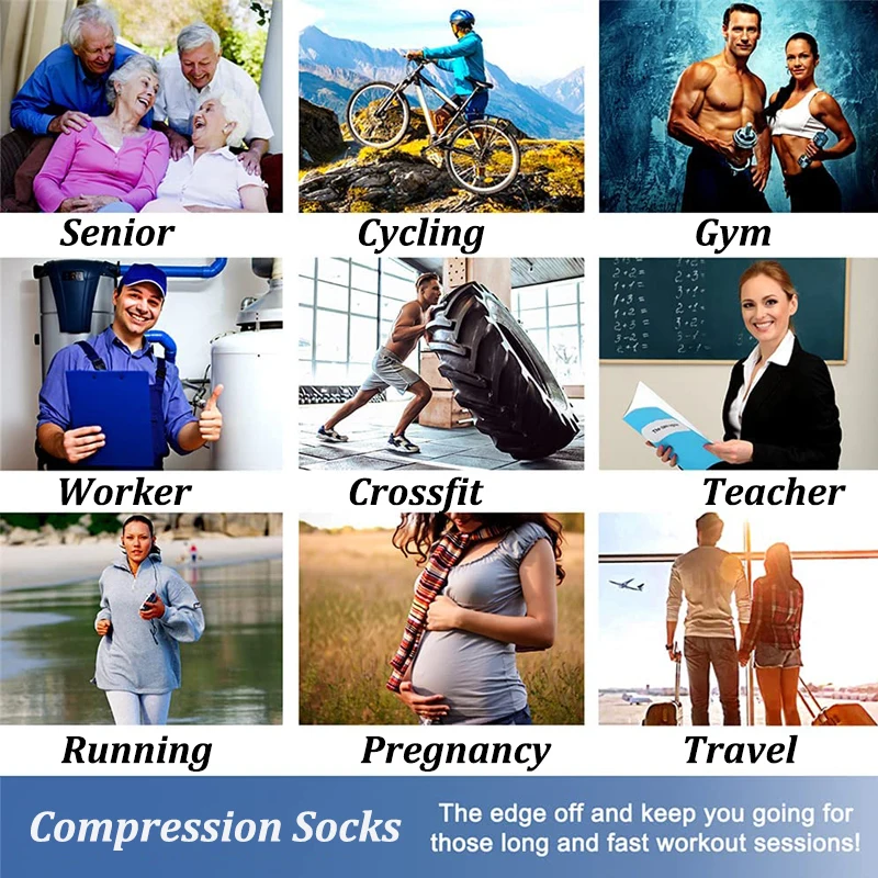 1. Компрессионная терапия-Компрессионные носки настолько отличаются от традиционных компрессионных носков, потому что мы используем самые высокие стандарты производства профессиональных спортивных носков, улучшает циркуляцию воздуха и постоянно сохраняет ваши ноги сухими и удобными. Наши компрессионные носки улучшают кровообращение, обеспечивают более быстрое восстановление, снимают варикозное расширение вен или отеки и лучше защищают ваши ноги