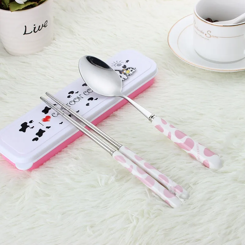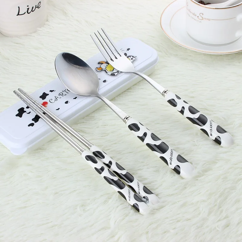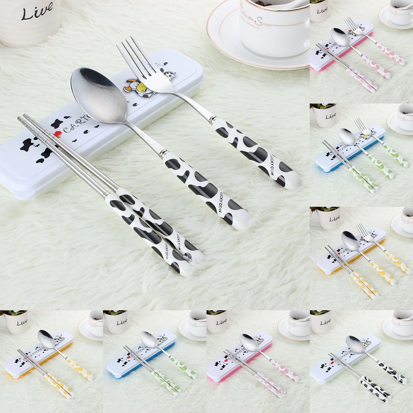 3 шт.компл. креативная керамическая ручка, ложка и вилка из нержавеющей стали и керамики с коровьим узором, палочки для еды, портативная детская посуда, подарок