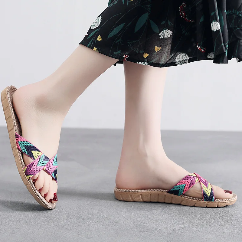 ★Слипоны на плоской подошве; Дизайн в полоску★Высокое качество, противоскользящие★Открытый носок, подходит для дома и повседневной жизни