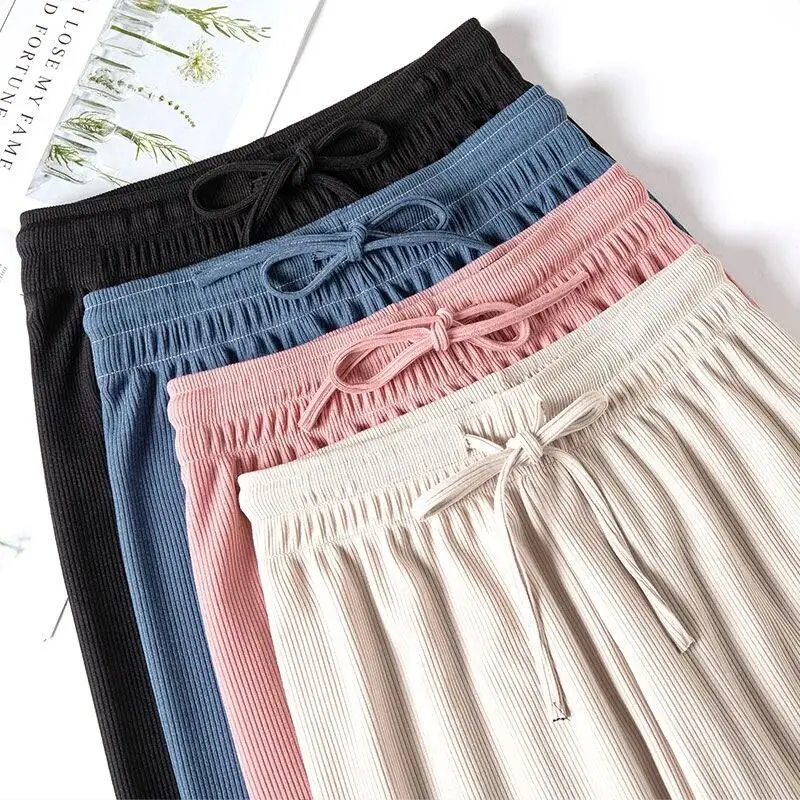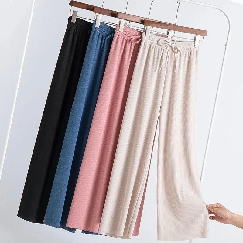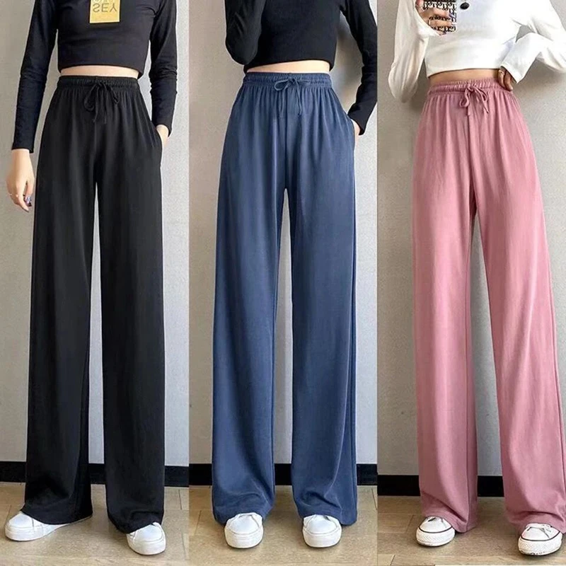 Женские легсветильник брюки из ледяного шелка, однотонные свободные прямые повседневные брюки с высокой талией для девочек, спортивные штаны