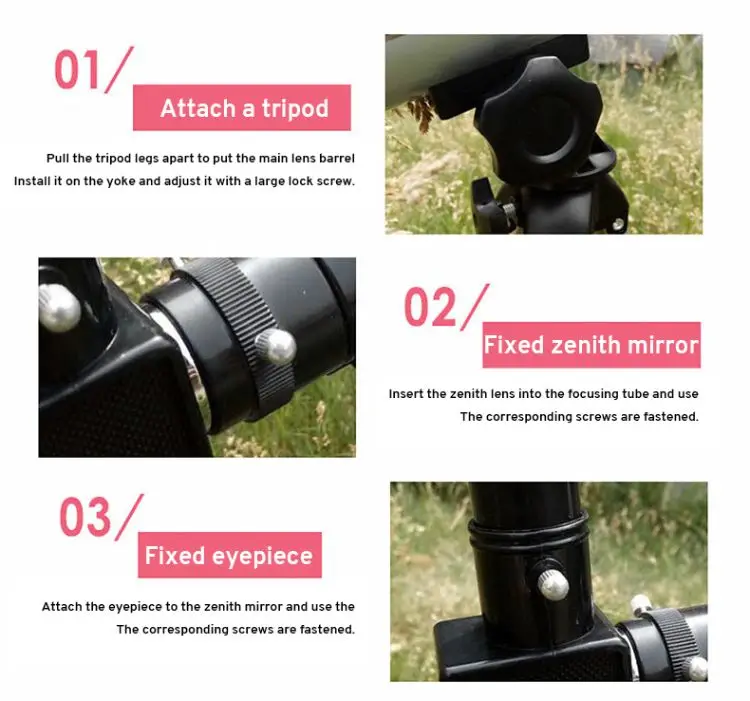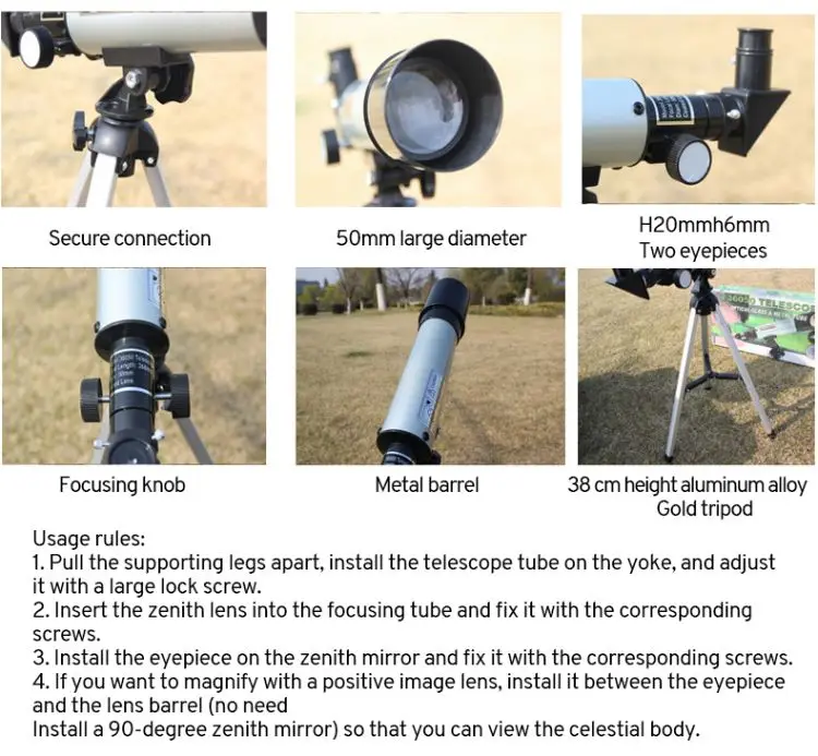 4. Если вы хотите использовать вертикальный объектив для увеличения, установите его между окуляром и стволом объектива для просмотра небесного тела (для конкретных операций, пожалуйста, обратитесь к руководству) 36050N студенческий и детский маленький монокулярный телескоп, высококачественный астрономический телескоп