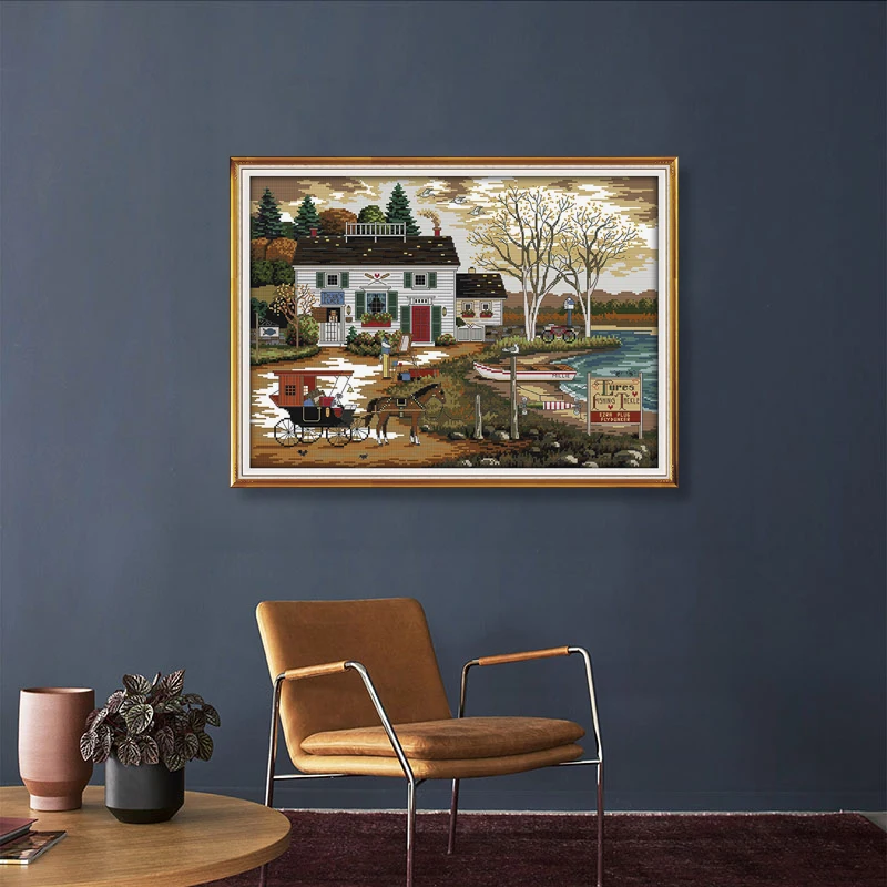 Вышивка крестом, пейзаж, домики у озера, 11CT, 14CT, наборы для выш...