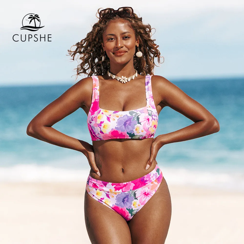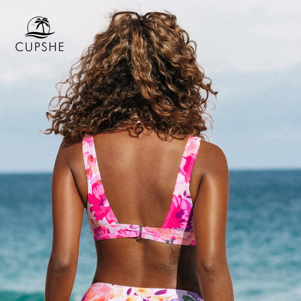 CUPSHE, розовый цветочный Топ бикини с квадратным вырезом, только для женщин, сексуальный, со съемной подкладкой, на спине, с крючком, на бретелях, 2022, Раздельный купальник, бюстгальтер, Топ