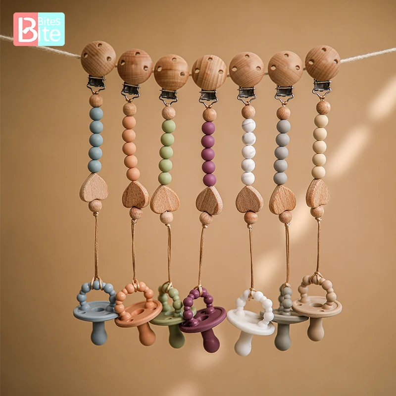 2 шт.компл. детская деревянная цепочка для соски-пустышки, силиконовая цепочка для соски, бусины из пищевого силикона, держатель для пустышки, зажимы для сердца, детский Прорезыватель для зубов