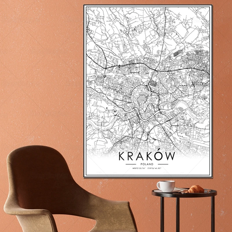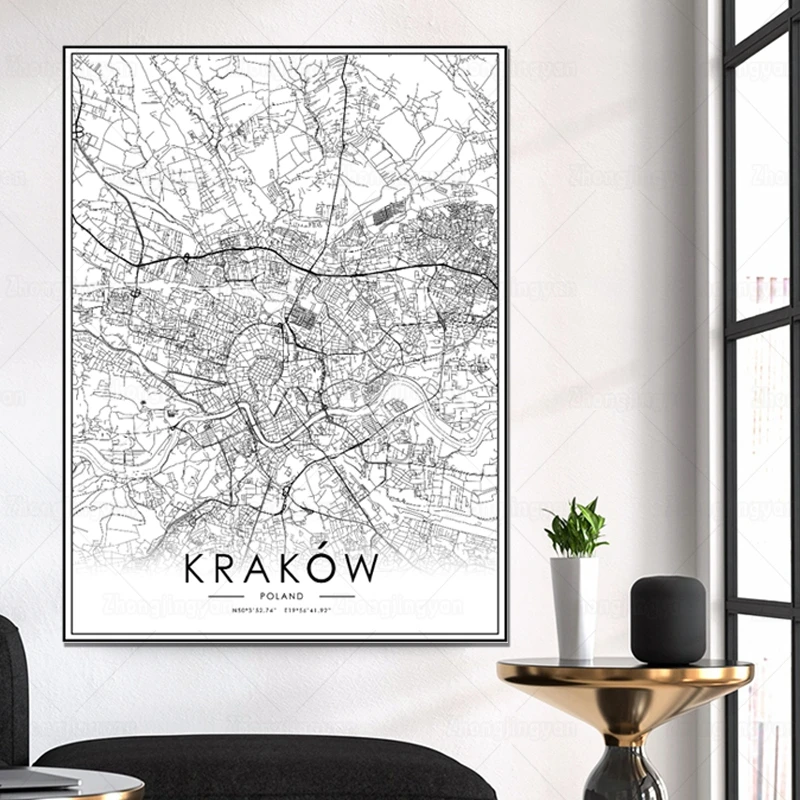 Черно-белая карта города Польши, Карта города Краков, плакат, HD печать, настенное искусство, холст, скандинавский ландшафт, живопись для домашнего декора