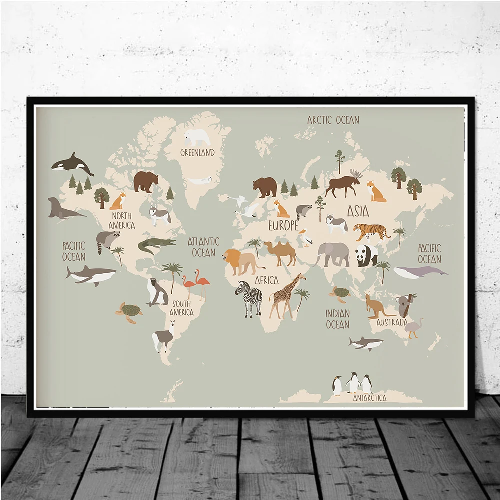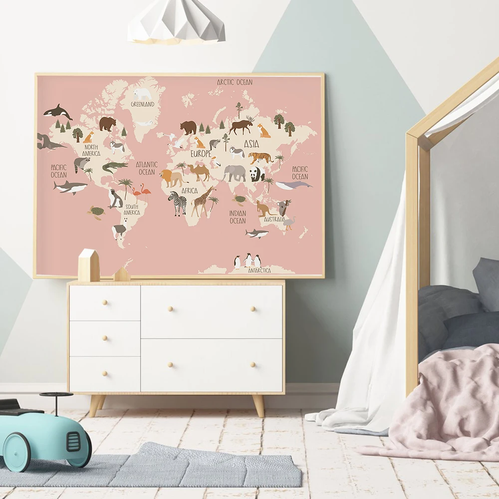 Животные карта мира детская настенная Картина на холсте скандинавские постеры и принты милые Мультяшные животные картины декор детской комнаты