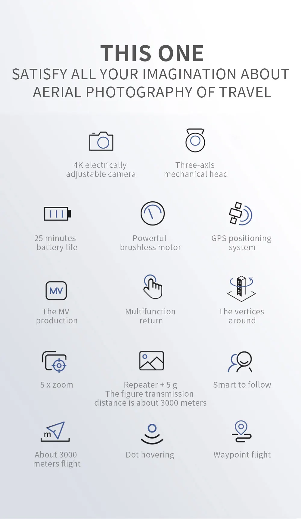Параметры продукта:Описание продукта: 3-осевой механической pan tilt (4K Wi-Fi камера)Размер продукта: u-образный: 33x32,5x13,5 (см)Размер: 11,8x16,1x13,5 (см)Цвет изделия: перламутровый серебристо-серыйМатериал: АБС-пластикЧастота приема: 5,15-5,35 ГГц; 5,725-5,825 ГГцКоличество каналов: 4Внешний вид: складной самолетаВозраст: 14 +Параметры батареи/Система питанияАккумулятор: 11,1 В 2600 мАчВремя зарядки: около 7 часовРежим зарядки: USB type-CВремя работы одной батареи: около 28 минутБатарея дистанционного управления: 3,7 в 1500 мАчСрок службы батареи пульта дистанционного управления: 2,5 часовМодель двигателя: 1806Мощность мотора: 4AРегулировка мощности: 12aРасстояние дистанционного управления: 3 кмСкорость: 8 м, 6 м, 4 м (м/с)Параметры линзРазрешение: Мобильный: 3840x2160p (фото)1280x720p (видео)SD карта: 3840x2160pУгол объектива: FOV: 70 ° расстояние возврата: 3 кмИзображение сигнала: 2,4G + 5g мостСкорость передачи кадров: 15 кадров в секундуGPS расстояние: 10-50 мРасстояние распознавания жестов: 1-3 мФункция выставления цены/совершения покупки свяжитесь точка1: 3-осевая панорама наклона объектива оснащена широкоугольным 4K высокой четкости Wi-Fi, которая может регулироваться от заявленного из-за угла съемки фронтальной камеры на пульте дистанционного управления. 3-х осевой функции панорамирования, наклона и делает летательные аппараты съемки видео четче и более стабильным, и угол наклона делает поле зрения шире2: со встроенным компьютером передача изображения на самом деле составляет 3 км (в безбарьерной среде), а передача изображения на большие расстояния увеличивает чувство опыта и зрения потребителя3: точное позиционирование, с GPS точное позиционирование, может достичь одного ключа возврата, нет сигнала возврата, низкая мощность возврата, избежать потери полета4: ультра длинная выносливость 11.1v2600 мА литиевая батарея, с выносливостью около 28 минут, увеличивает чувство полета5: индивидуальный путь. Вы можете нарисовать картинку, которую вы хотите лететь в приложении6: интеллектуальное отслеживание, объемный полет, контроль ладони, позиционирование карты в реальном времени, беспилотный летательный аппарат, выход из контрольной карты, планировка пути, управление мобильным телефоном приложения, возврат одной кнопки, вверх и вниз, вперед и назад, левый и правый боковой полет, автоматическое переключение оптического потока/GPS7: бесщеточный двигатель, обеспечивает более мощную мощность и более долговечный срок службы, сильное чувство скорости, сильный взрыв, хорошее сопротивление ветра