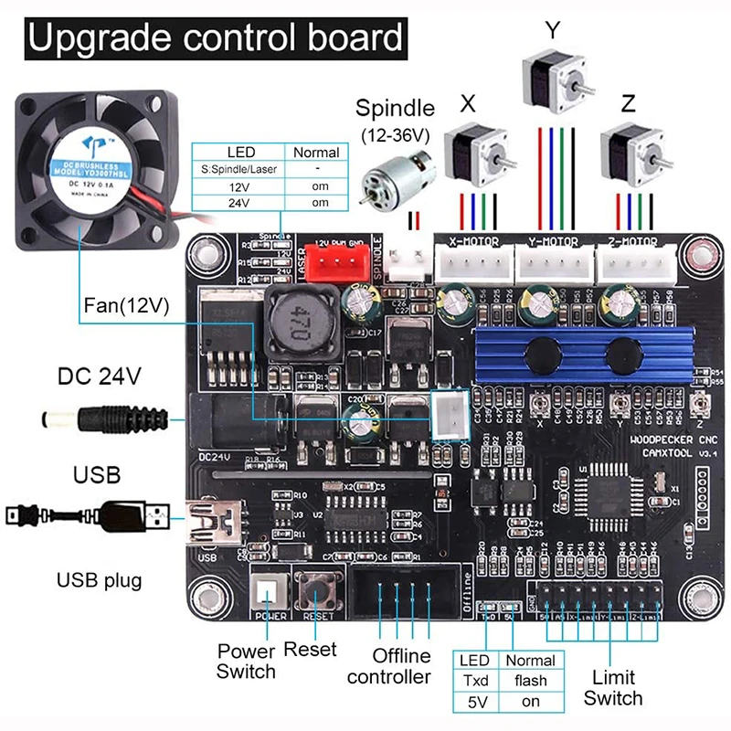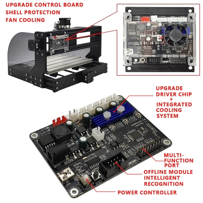 Плата управления: обновленная версия с корпусом и вентилятором, лучше подходит для защиты от пыли, охлаждения и увеличения времени гравировки и срока службы, прошивка GRBL1.1f, поддержка автономной работы