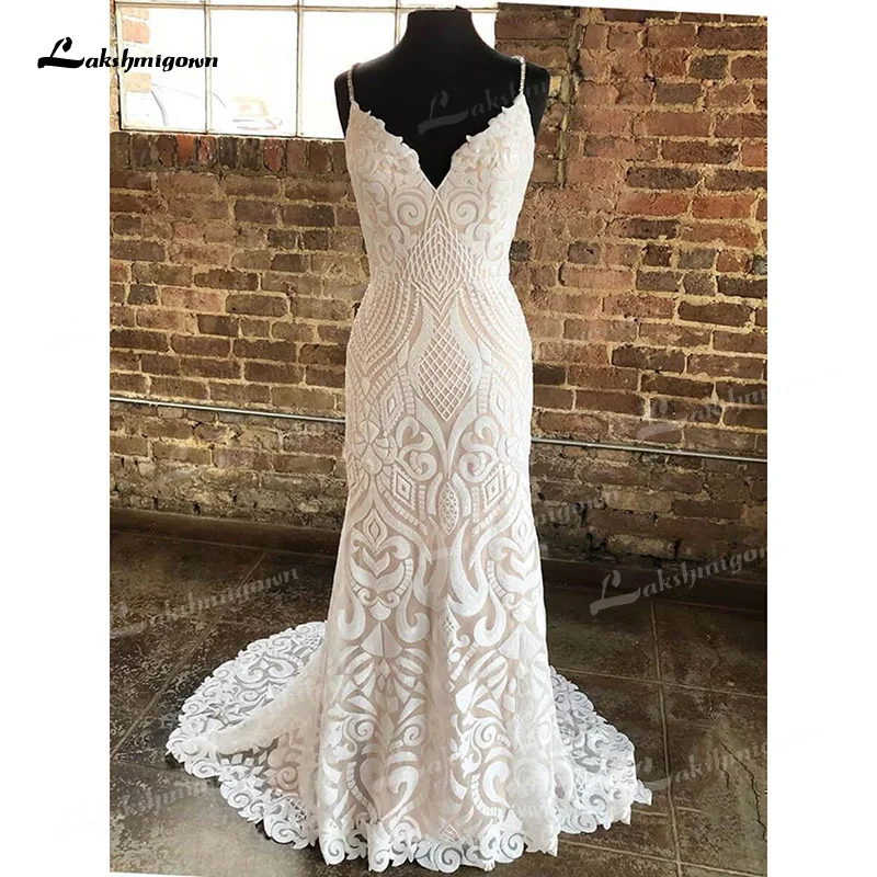 Женское свадебное платье с юбкой годе, кружевное платье на тонких бретельках с V-образным вырезом, без рукавов, со шлейфом, открытой спиной и аппликацией