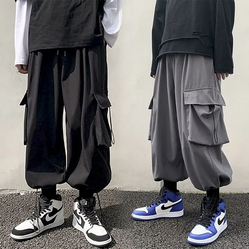 Мужские повседневные брюки-карго, однотонные, с карманами, длиной до щиколотки, с эластичной талией, модная уличная одежда, в Корейском стиле, простые, шикарные, свободные, в готическом стиле