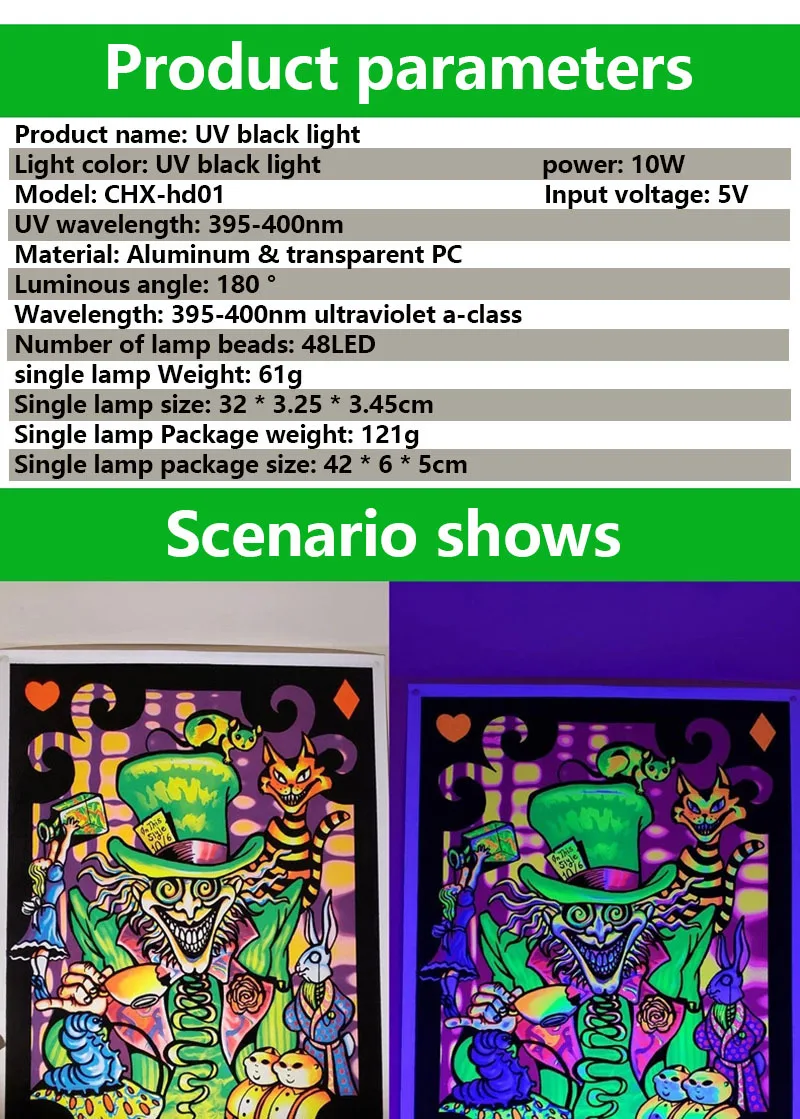 Характеристики:1. Портативный черный светодиодный УФ-светильник, супер яркий и светильник.2. Легкий контроль, переключатель вкл./выкл., высококачественный ультрафиолетовый светильник.3. Широкое применение: создание потрясающих атмосфер для концертов, вечеринок и сцены DJ и т. Д. Отлично работает с УФ-красками и флуоресценцией. УФ-отверждения чернила, чернила и клеи доступны.4. Особенности: длина волны 395-400НМ, не вредно для сетчатки или кожи. Без балластов. Без мерцания.5. Рекомендуемый Видимый флуоресцентный материал: краски для лица и тела, светящиеся палочки, воздушные шары, пузырьки, свечи, чернильные ленты, чернила, футболки, перчатки, плакаты, настенные наклейки, посуда и т. д.6. Легко установить. Просто используйте прилагаемые соединения давления, чтобы повесить его и вставить вилку в светильник.7. Чем больше УФ-лучей, тем ярче он блестит.8. Идеально подходит для Хэллоуина и рождественских вечеринок, игр, мероприятий и галереи.Характеристики:Материал: ПВХ + алюминийСветовые эффекты: лучСветильник Цвет: УФ-защитаДлина изделия: 32 смМощность кабель Длина: 1,8 мМощность: 10 ВтДлина волны: 395-405нмУгол луча 180 градусовВходное напряжение: AC85-265VКоличество ламп: 40 светодиодныйРазмер: 320*32,5*34,5 ммВилка: вилка США/ЕСПосылка включает в себя:1X Светодиодный УФ-светильник1X Кабель питания США/ЕС с переключатель вкл./выкл.1 комплект монтажных аксессуаров (винты, фиксированные зажимы, задняя крышка, без соединений)Классы:1. Из-за световых эффектов, яркости монитора, настроек контрастности и т. д. могут быть некоторые незначительные различия в цветовом тоне изображений и фактическом товаре.2. Пожалуйста, учитывайте разницу в 1-2 мм из-за ручного измерения, спасибо.