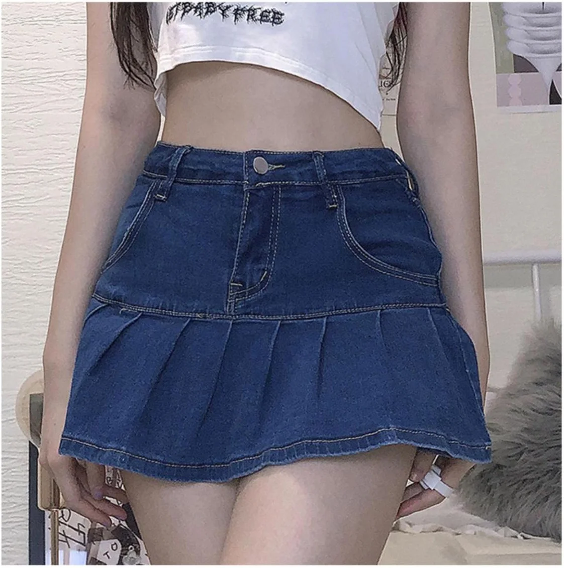 Женские джинсовые мини-юбки, плиссированные мини-юбки с высокой талией, на молнии, летняя уличная одежда в стиле 90-х, Y2K, обтягивающая синяя юбка