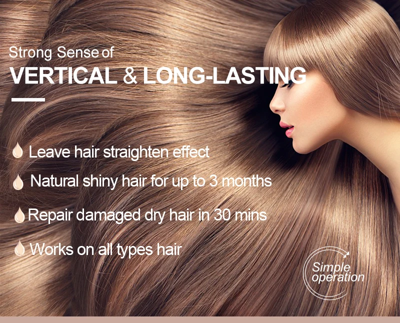 1. 30 минут восстановления поврежденных сухих волос2. Для выпрямления волос3. Устраняет вьющиеся волосы4. Сделать волосы более блестящими, гладкими.5. Прямой эффект может длиться 3 месяца
