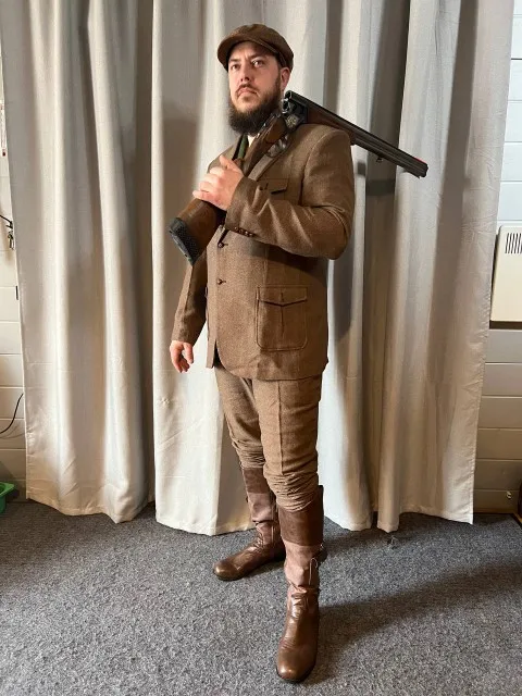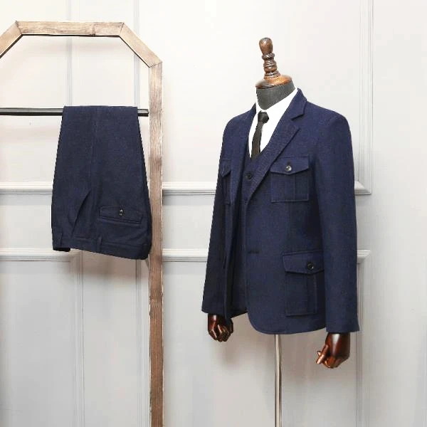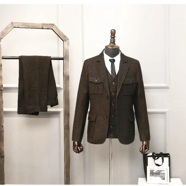 Костюм мужской из 3 предметов, лацкан, однорядный, 2 пуговицы, елочка, застежка на пуговицах, карман, коричневый цвет, Повседневная Формальная одежда для мужчин