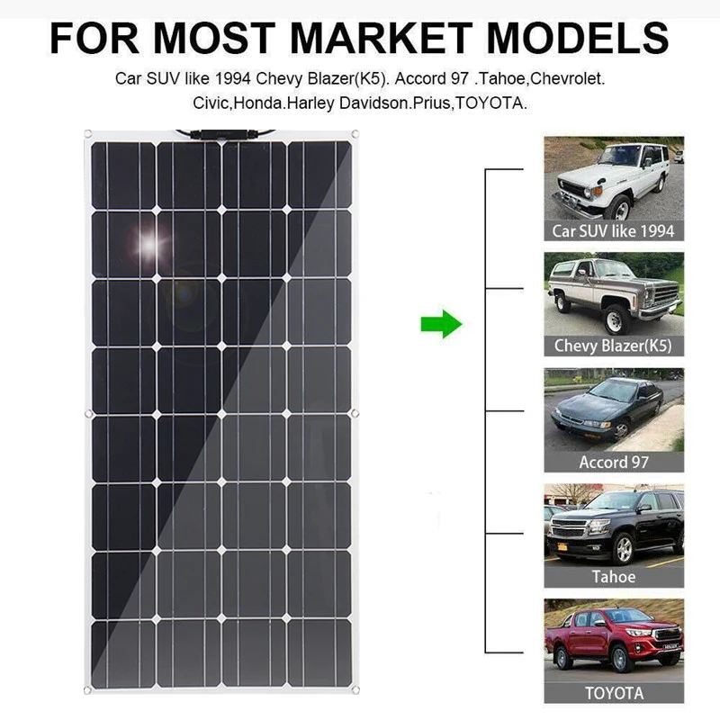 Особенности:-- Гибкая солнечная панель-Высокая мощность, подходит для улицы и RV-- Эва (этиленвинилацетат) + PET защитная плёнка для переднего панель, гибкий, светильник и прочный, светильник вес-Эффективность монокристаллических кремниевых солнечных элементов составляет 20%.-- 4x люверсов и 2x бесплатно Ranunculus более удобны в установке.-Водонепроницаемость IP65, подходит для использования на открытом воздухе под дождем, светильник.-- Упаковать правильно с губкой и угловыми прокладками.-Он может использоваться в аккумуляторной машине, автомобиле, RV, яхте, корабле, самолете, спутнике, космической станции, открытом разведении, посадке, туризме, солнечной уличной лампе, научно-исследовательских проектах и т. д.