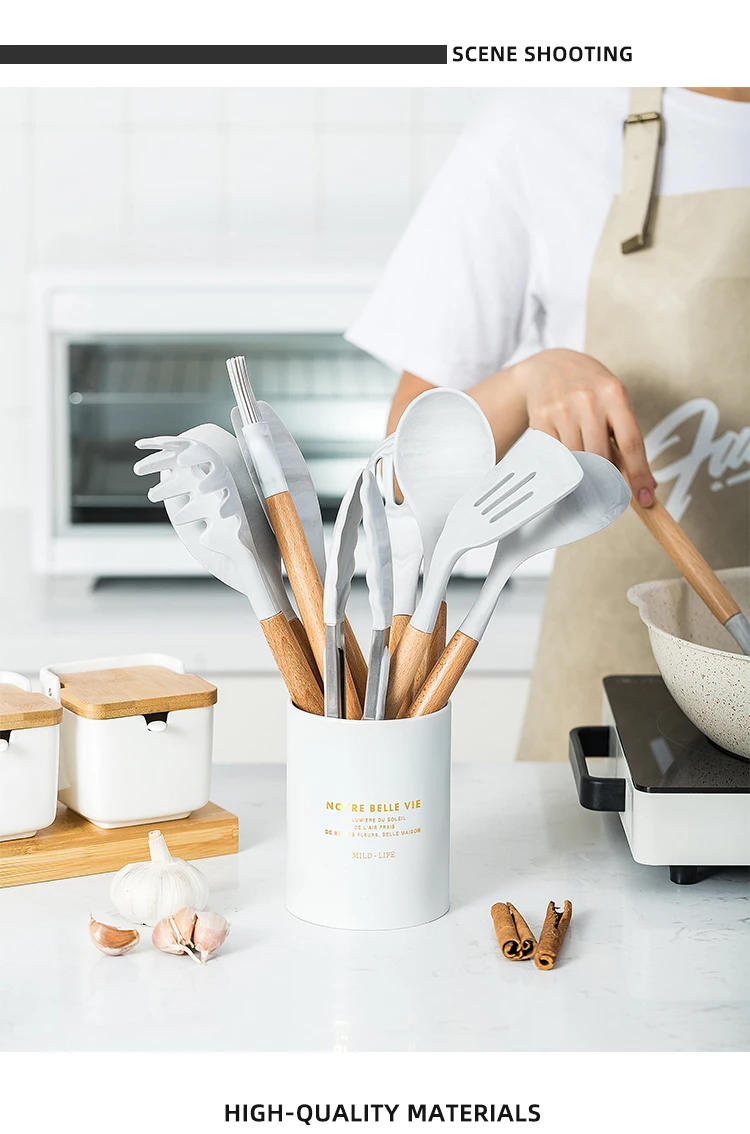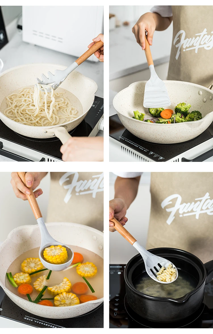 Защита окружающей среды, нетоксичный, термостойкий, антипригарный, прочный, безопасный, легко чистится продукты для кухонной посудыПодходит: микроволновая печь, тостер, пароварка, можно варить и стерилизовать.Материал: Улучшенный Силикон + Натуральное дерево из акацииЦвет: белыйРазмер: как на фото