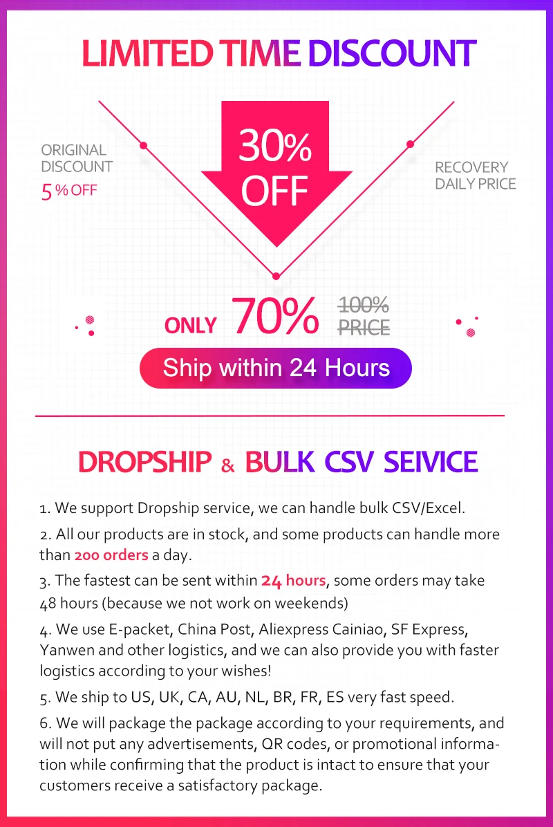 1. Мы отправляем товар во все регионы мира,2. Мы тщательно упаковываем каждый товар перед отправкой.3. Эти товары готовы на складе и будут отправлены в течение 24 часов.Логистика и время доставки: отправка стандартной экспресс-доставки, отслеживание информации на протяжении всего.4. Бесплатный возвратВозврат по любой причине в течение 15 дней