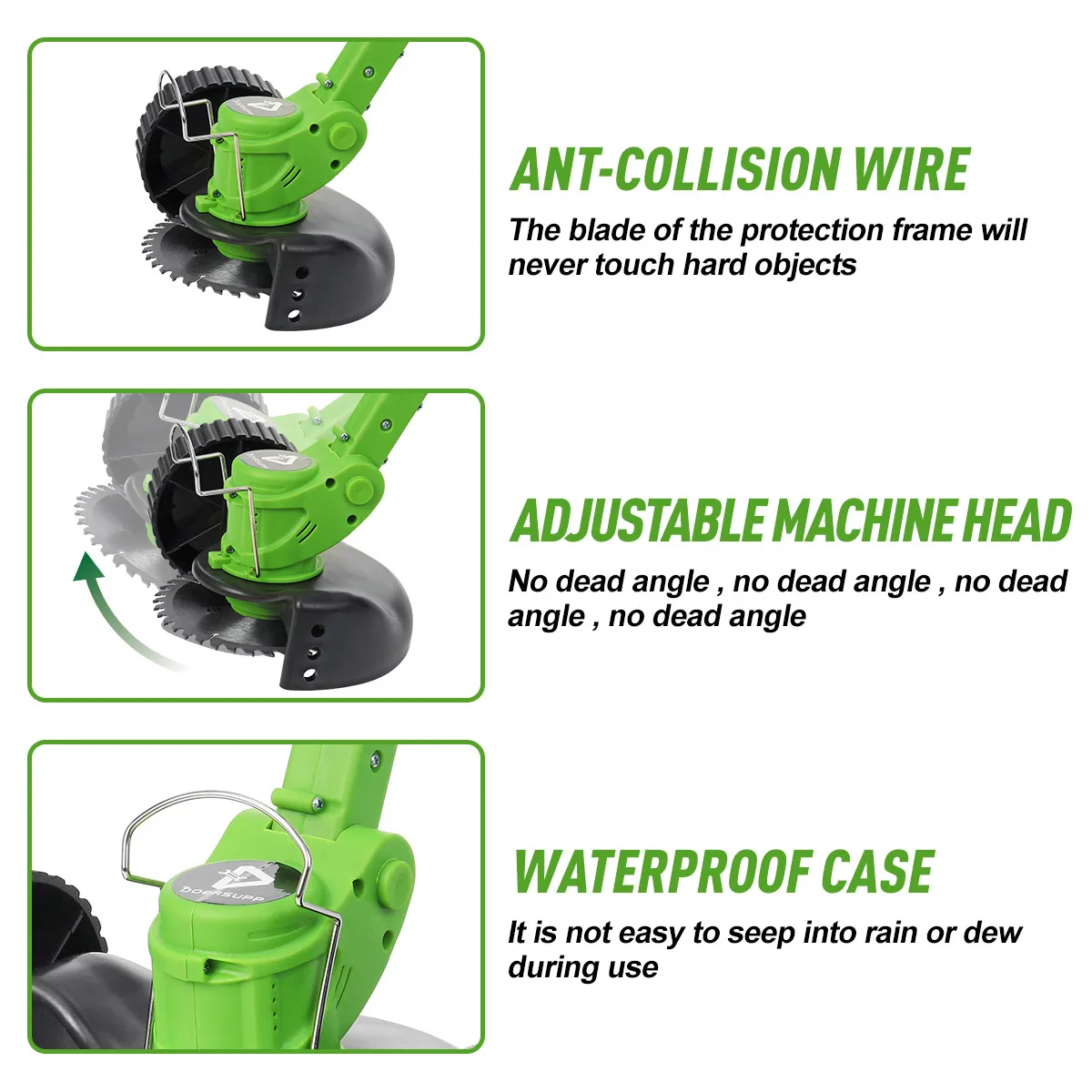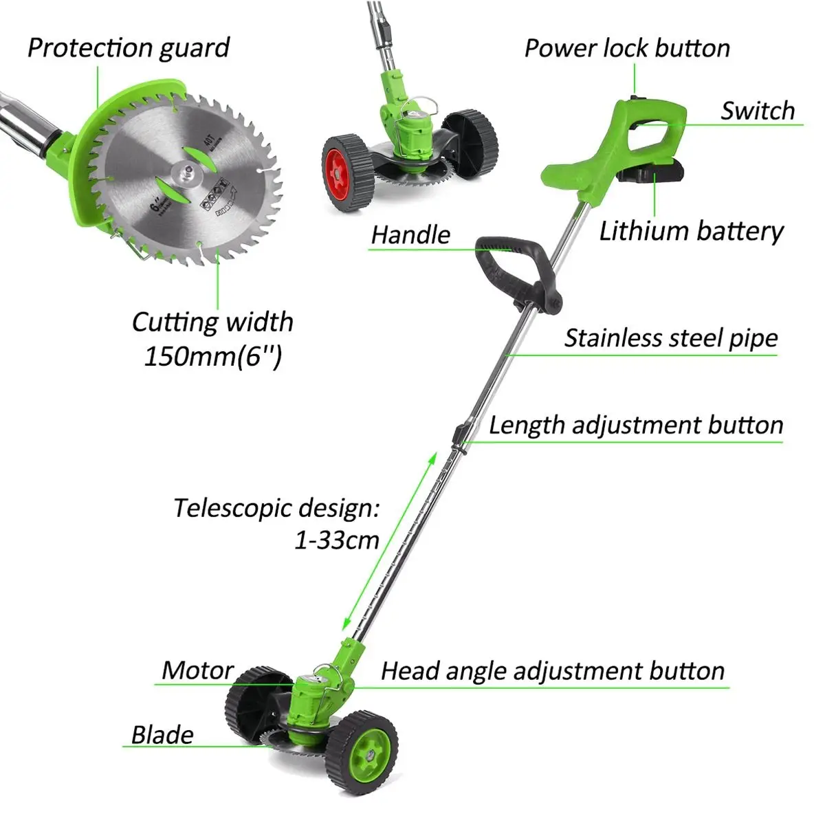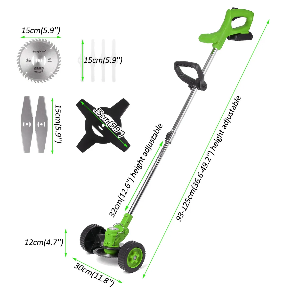 Особенности:-Двигатель из чистой меди, высокая мощность, быстрая скорость.-Провод для предотвращения столкновений, лезвие защитной рамы никогда не прикасается к твердым предметам.-Регулируемая головка машины, без мертвого угла.-Водонепроницаемый Чехол, не легко просачиваться в дождь или розу во время использования.-Диаметр резки, диаметр резки до 150 мм, высокая эффективность.-Удобная вспомогательная ручка, удобная ручка, без ручного трения, положение можно регулировать по желанию.-Двойное переднее колесо, более удобное для работы в течение длительного времени.-Двойная ручка переключателя управления, более удобная работа, высокий коэффициент безопасности.-Светодиодный дисплей батареи, легко понять оставшуюся емкость аккумулятора и контролировать нагрузку.-16-раздел полюс может быть отрегулировано по своему желанию, со степенью расширения 1-33 см, а высота может быть отрегулировано по своему желанию в соответствии с потребностями.Спецификация:-Цвет: красный, зеленый (по желанию)-Штепсельная Вилка: штепсельная вилка стандарта США, штепсельная вилка европейского стандарта (опционально)-Напряжение: 12 В, 24 В (опционально)-Материал: АБС-пластик + алюминий + сталь-Время без нагрузки: около 2-3 часов-Мощность: 1500 Вт-Емкость аккумулятора: 12800 мАч-Количество батарей: 2 шт.-Время зарядки: 2-3 часа-Скорость без нагрузки: 35000 об/мин (макс.)-Диаметр резки: 150 мм (макс.)-Телескопическая Конструкция: 93-125 см/36,6-49,2 дюйма-Размер: 30x12x12 5 см/11.8x4.7x49.2''-Аккумулятор: подходит для аккумулятора MakitaПосылка включает в себя:1 x триммер для травы1 x вспомогательная ручка1 пара двухсторонних колес1 x циркулярная пила1 х стальная проволока3 х гаечный ключ1x4 зубчатое стальное лезвие2 x стальное лезвие4 x Пластиковые лезвия2 батарейки1 х адаптер1 x коробка