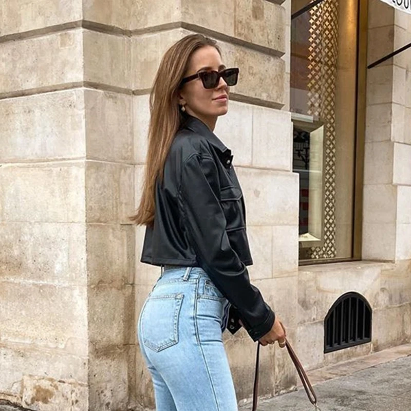 Женская Короткая кожаная куртка с длинным рукавом, кардиган на пуговицах, свободная куртка с карманами, осень 2021, Новая повседневная черная, белая