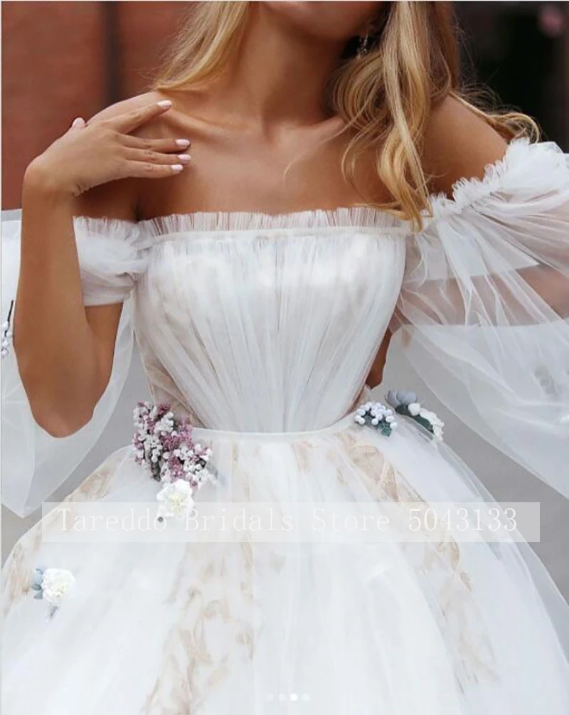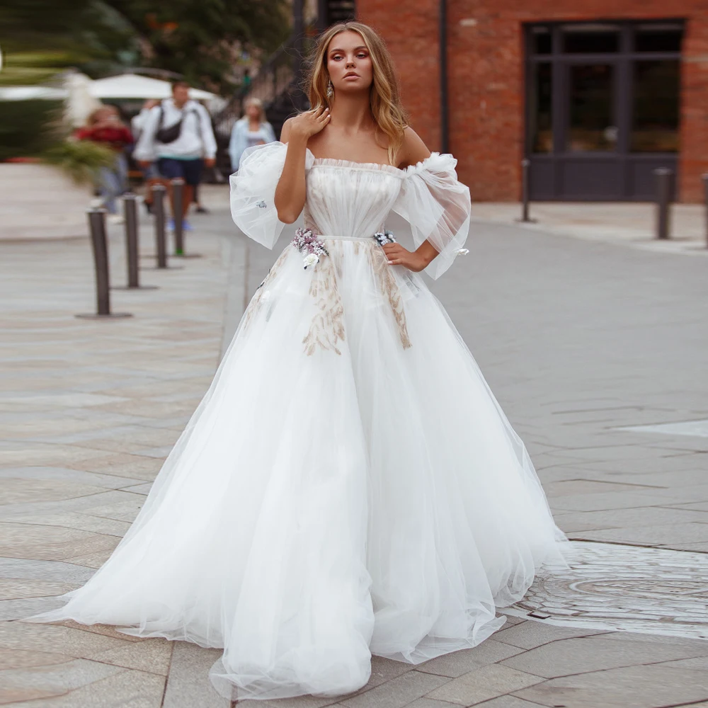 Потрясающие белые свадебные платья, уникальный вырез лодочкой, короткие рукава-фонарики, складки, трапециевидной формы, женское платье
