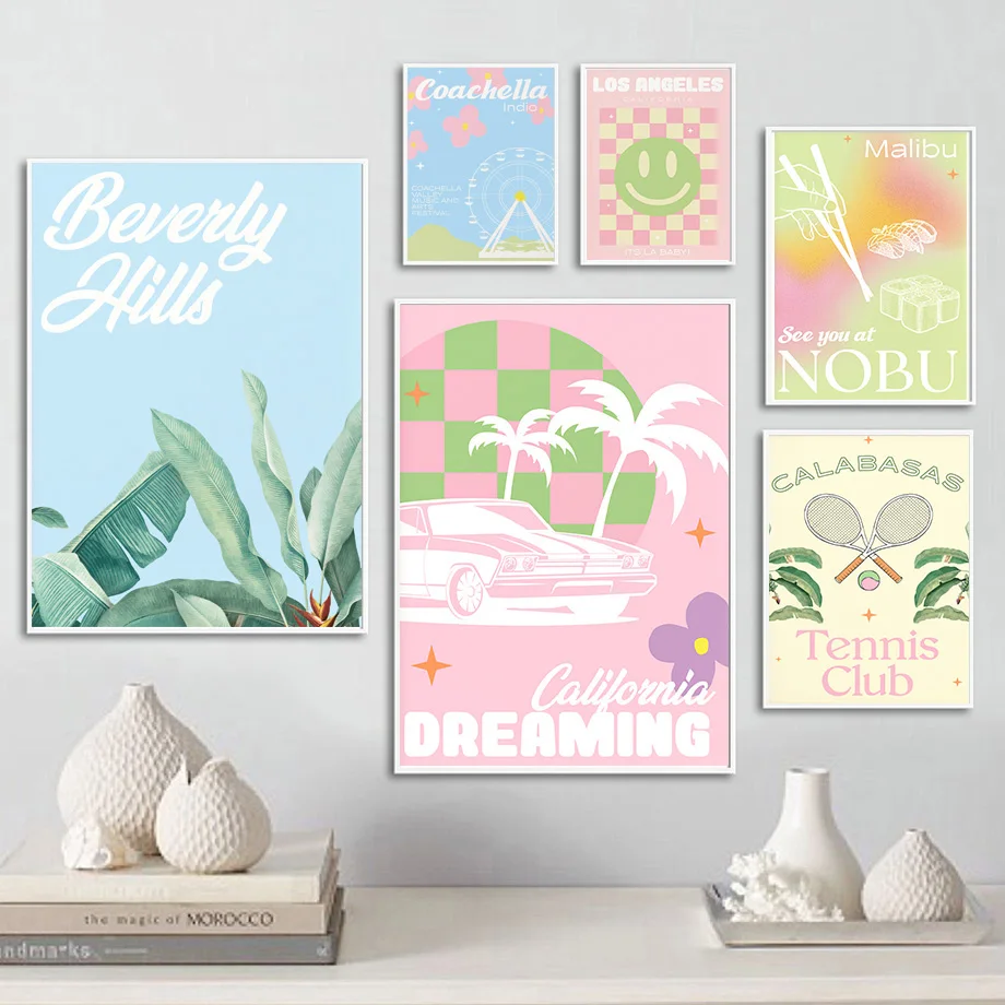 Розовая пляжная доска для серфинга, зонт, кокосовое дерево, настенн...