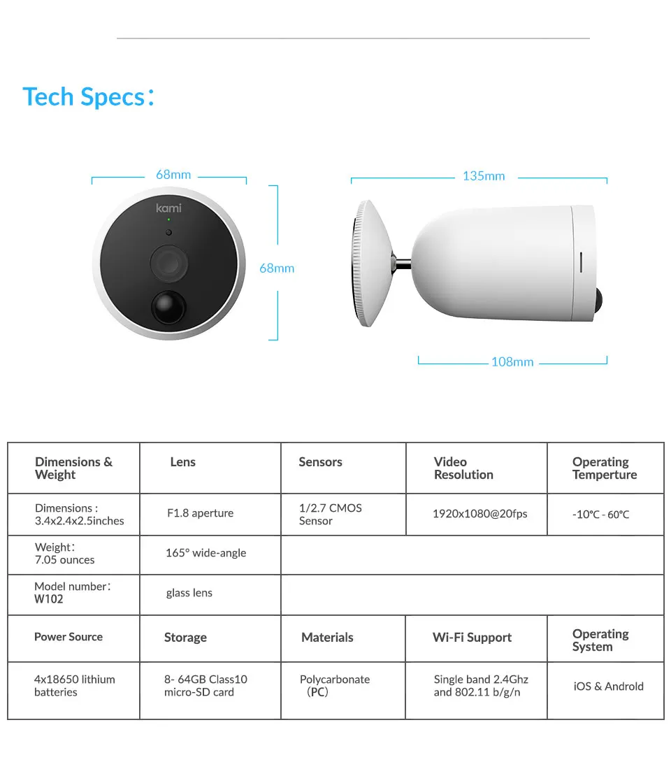Засчет высокотехнологичной степени защиты IP-65, камера Kami Wire-Free Outdoor абсолютно пыленепроницаема и способна работать в любых погодных условиях. Наблюдайте за безопасностью вашего помещения без помех!