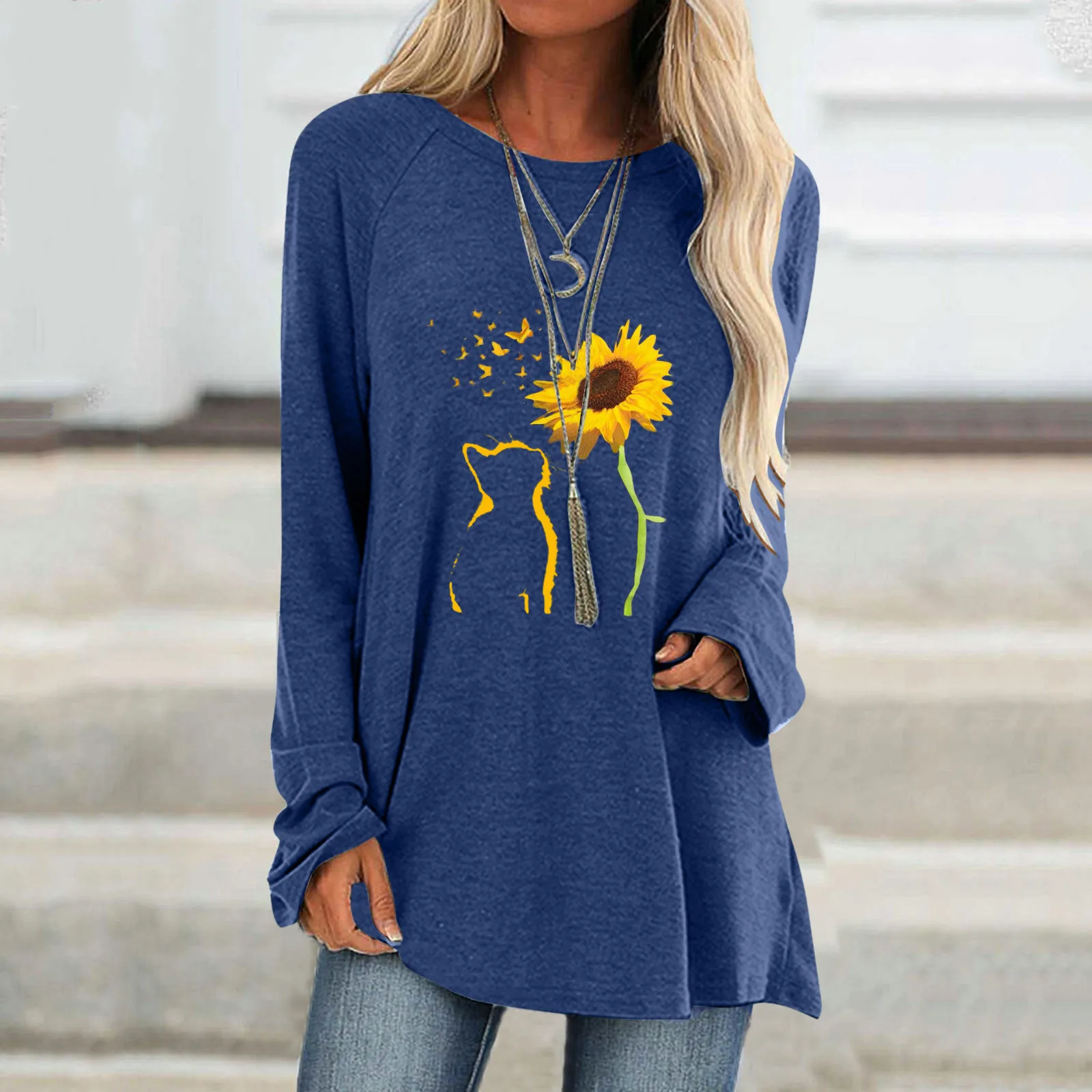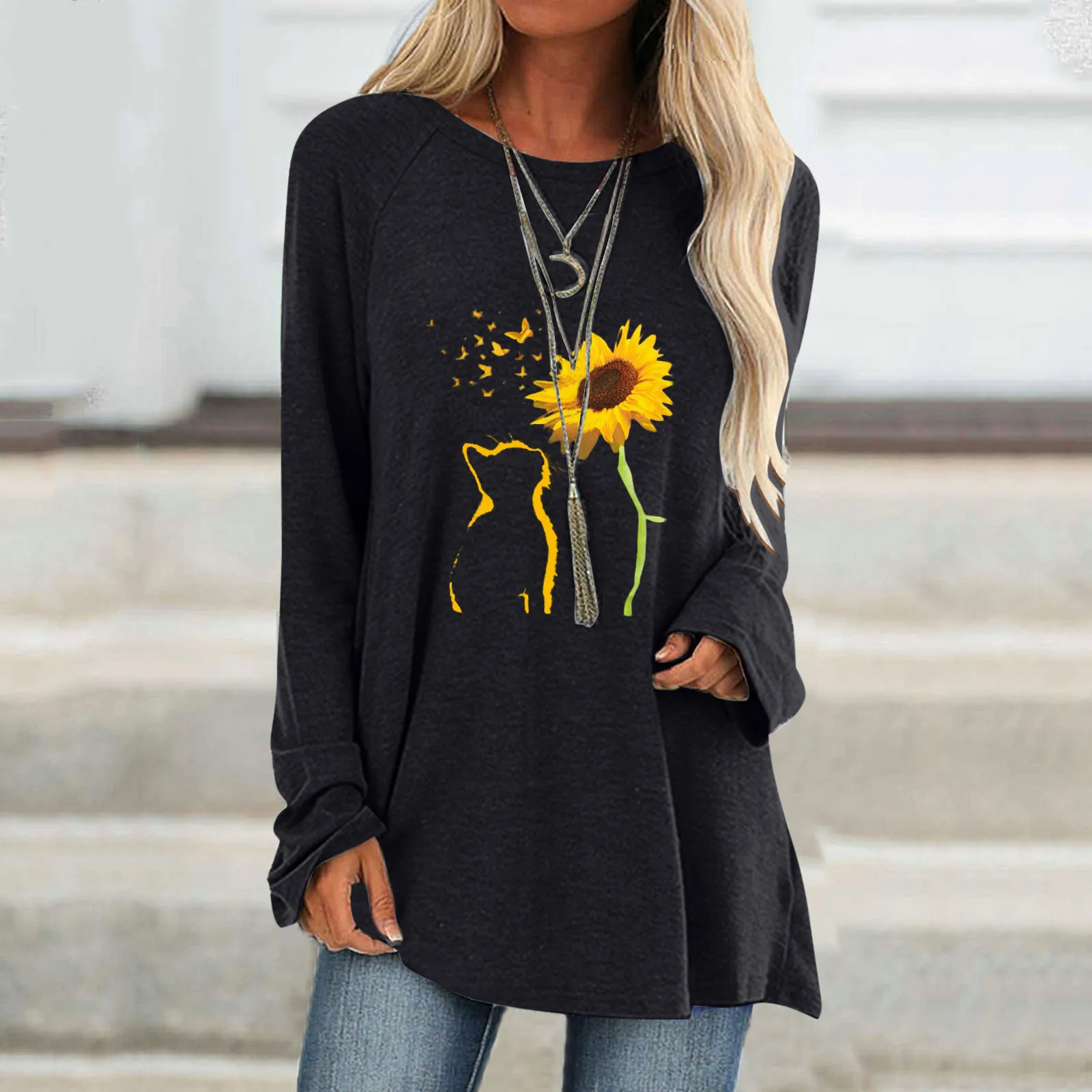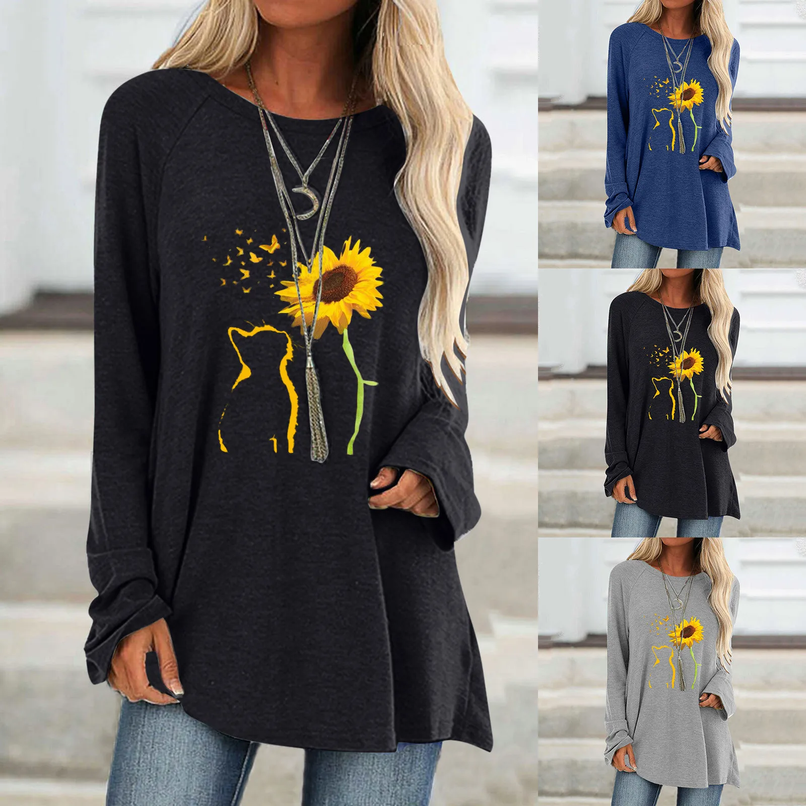 Сезонная футболка, женские топы размера плюс, футболки с длинным рукавом и круглым вырезом, свободные топы с изображением кота и принт подсолнечника
