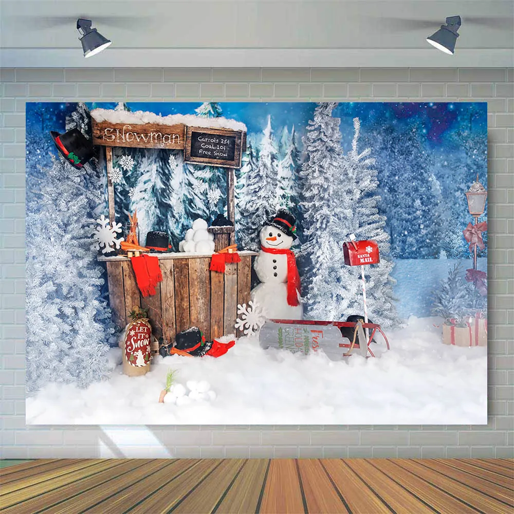Рождественская зимняя снежная сцена ПОРТРЕТНАЯ ФОТОГРАФИЯ фон Снеговик Дети Портрет фотография искусственная сосна магазин