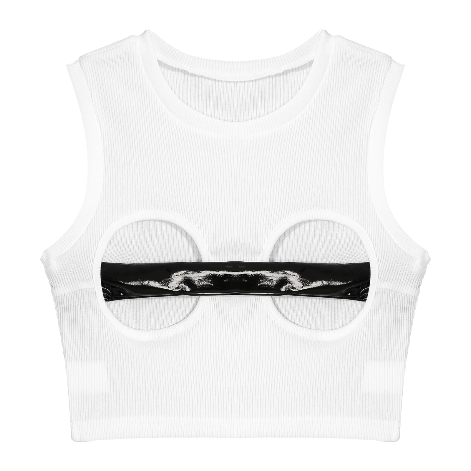 Женская модная экзотическая майка с мокрым эффектом, сексуальный укороченный топ из искусственной кожи в стиле пэчворк, Летняя ажурная футболка в рубчик без рукавов с круглым вырезом