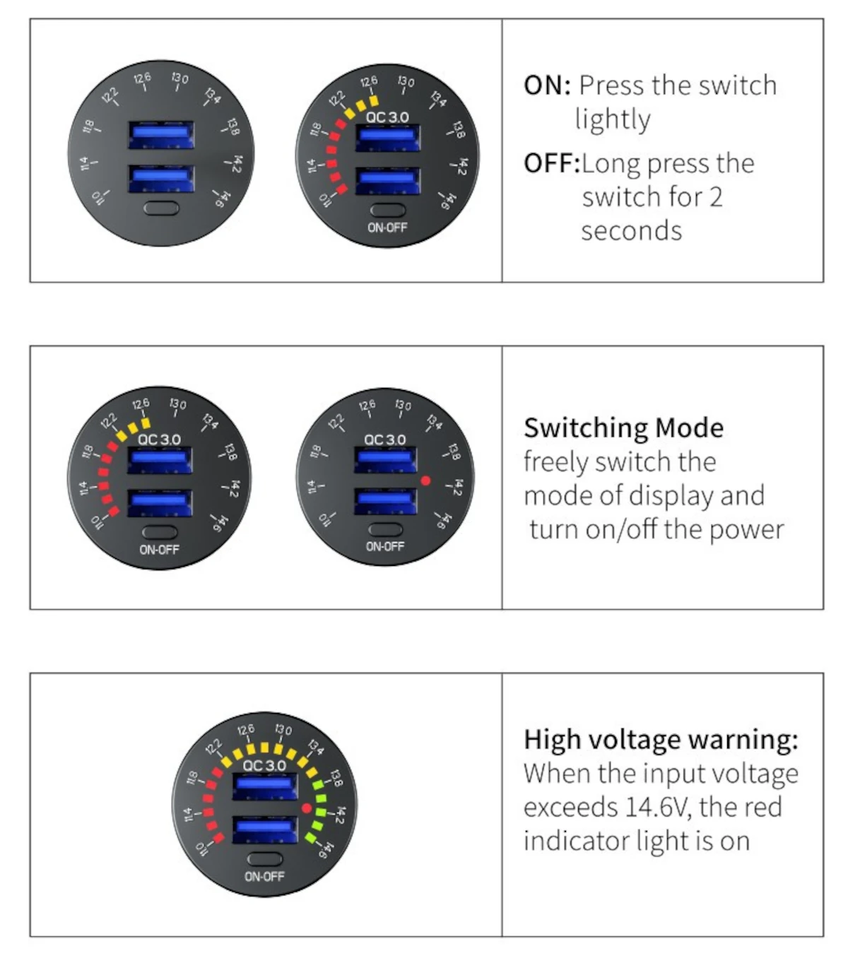 3. В тех случаях, когда напряжение на входе превышает 14,6 V, красный индикатор светильник включен (функция предупреждения, это означает, что вход
