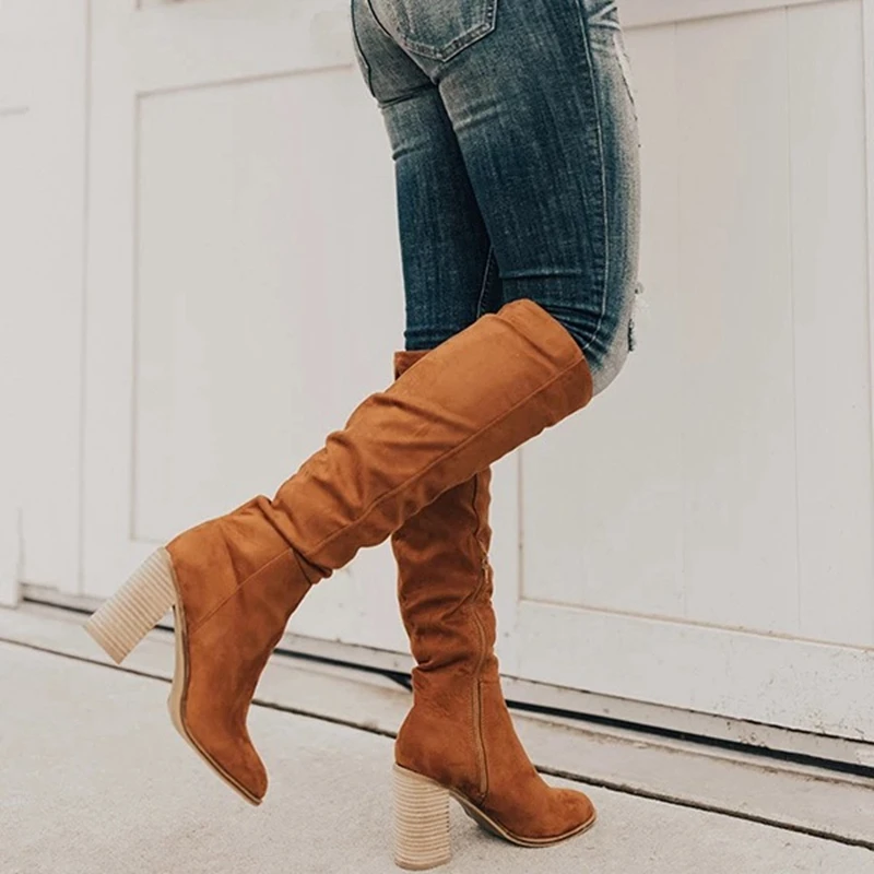 Осень 2021, женские высокие сапоги до колена на молнии, женские флоковые туфли на квадратном каблуке, Женская Повседневная однотонная обувь, женская уличная обувь