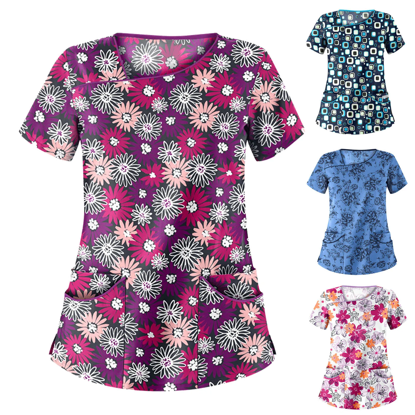 Униформа косметолога с цветочным принтом, хирургические Топы с коротким рукавом и V-образным вырезом, летние рабочие топы для салона красоты, зооклуба, рабочая одежда A50