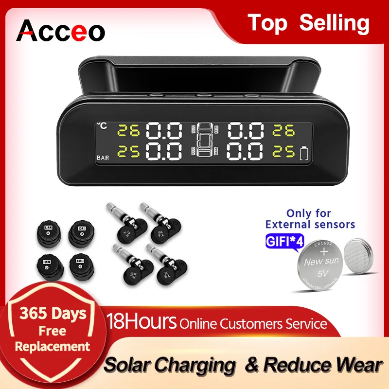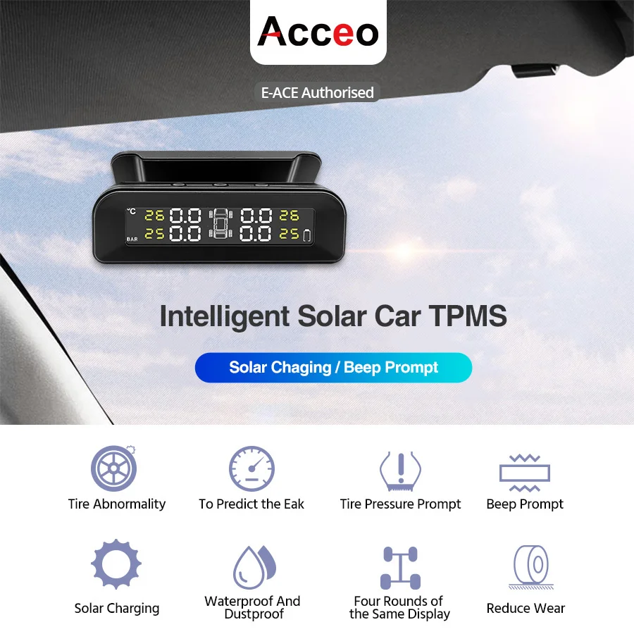 Система контроля давления в шинах ACCEO K07 TPMS CarTire, умный дисплей с 4 датчиками и зарядкой от солнечной энергии