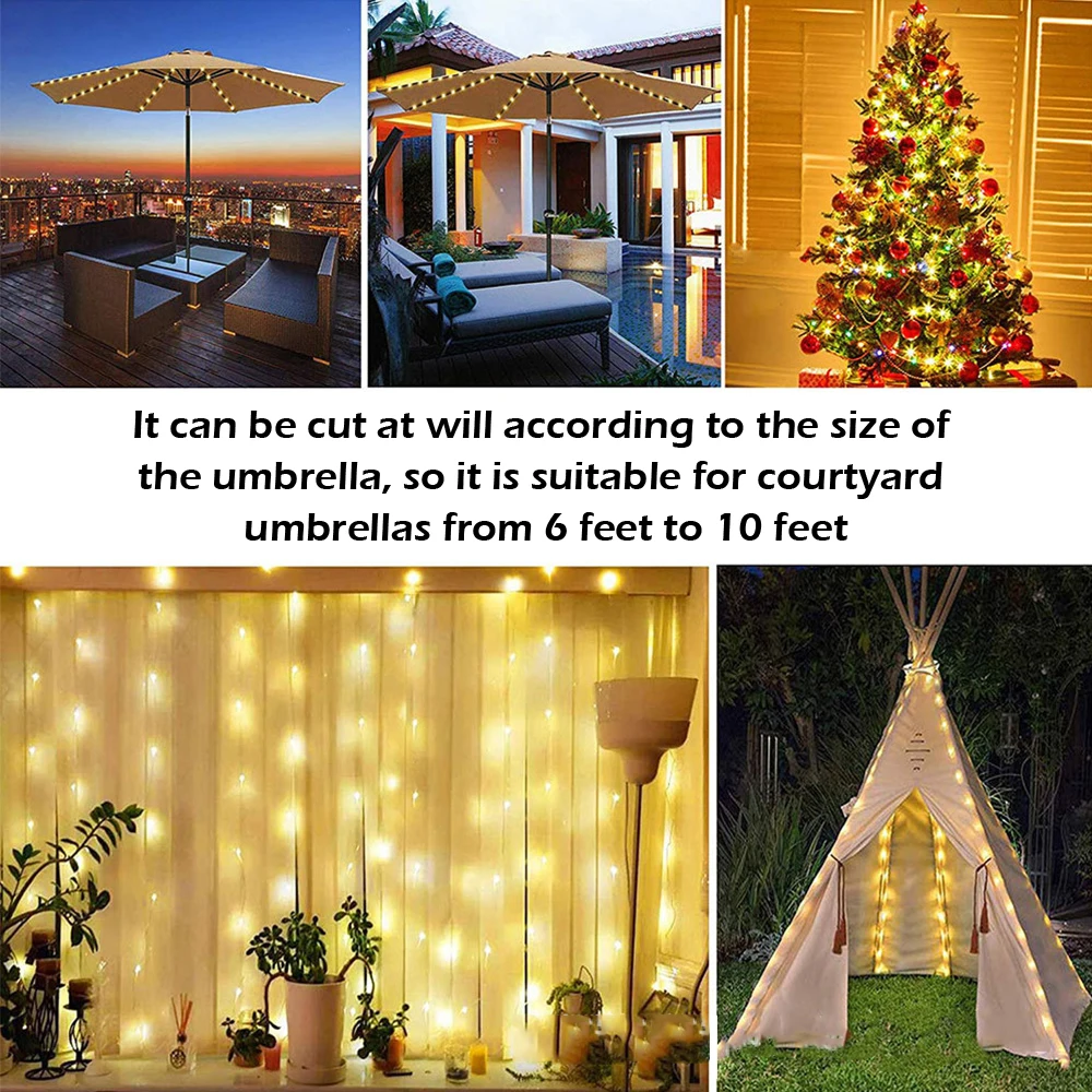 Креативный дизайн:8x14 светодиодов, каждая лампа имеет длину 140 см.Кроме того, каждый светодиод параллельноЕго можно разрезать по желанию в соответствии с размером зонта, Поэтому подходит для садовых зонтов от 6 до 10 футов.Вам нужно всего лишь обернуть световую планку вокруг кости зонта, чтобы завершить установку, Который подходит для общего стиля и консольных зонтов.