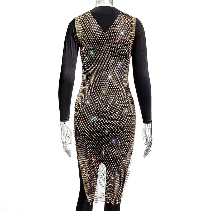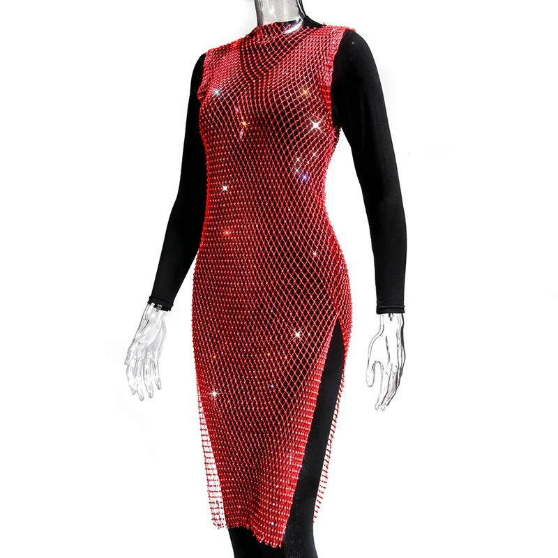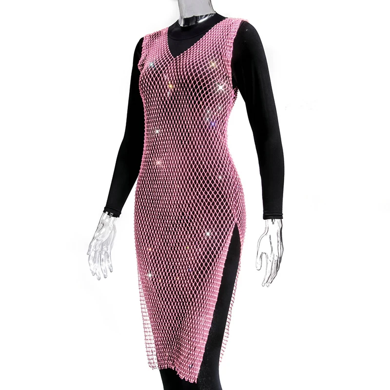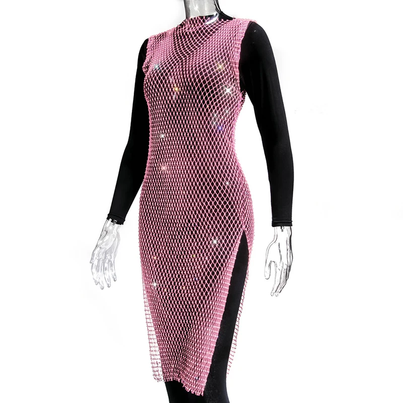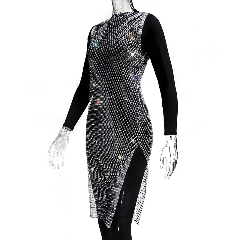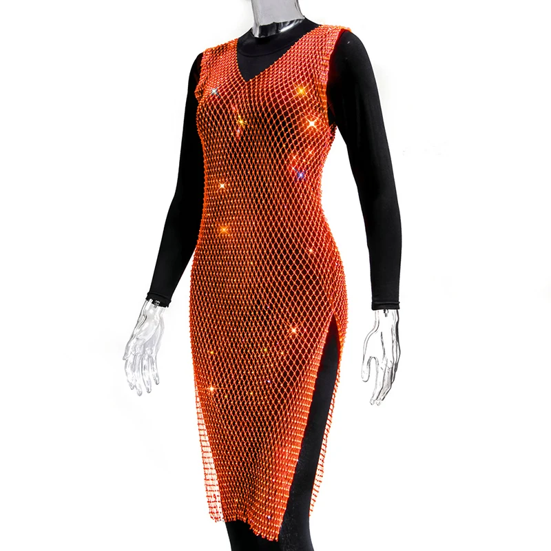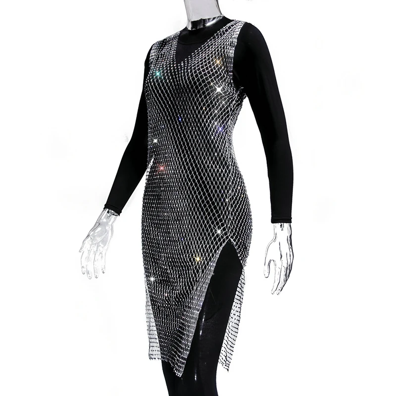 2021 однотонное платье без рукавов, пикантные, блестящие стразы прозрачные женские Разделение мини-платье
