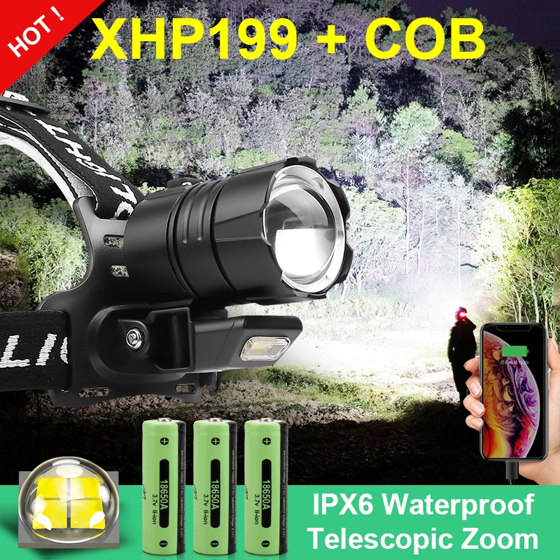 2021 Новый XHP199 Мощный перезаряжаемый светодиодный налобный фонарь 18650 Фара USB налобный фонарь Водонепроницаемый зум-налобный фонарь с COB