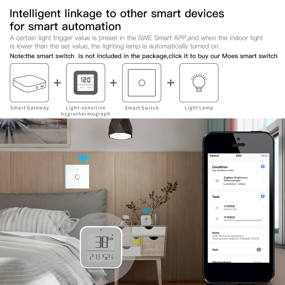 1. The smart brightness thermometer senses the changes in ambient light, temperature, and humidity in real time; it actively reports to the client through the Smart Life App with built-in Bluetooth protocol. High-precision real-time detection of indoor brightness, temperature and humidity.