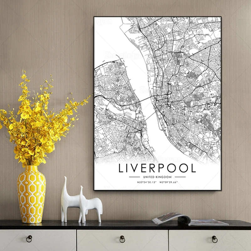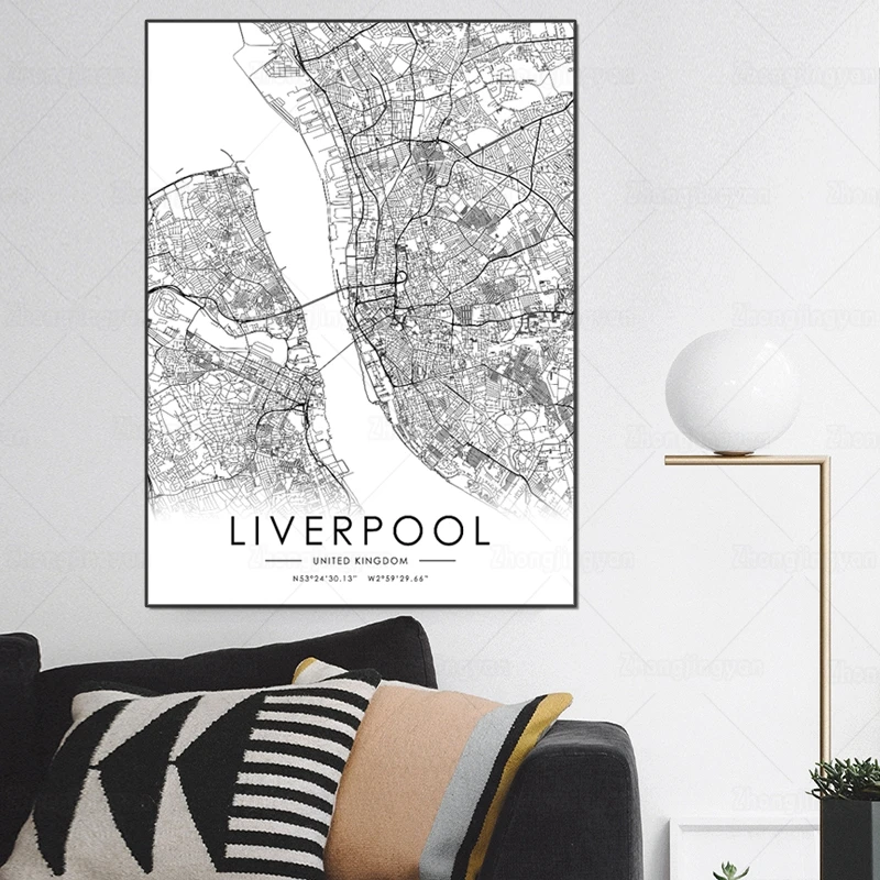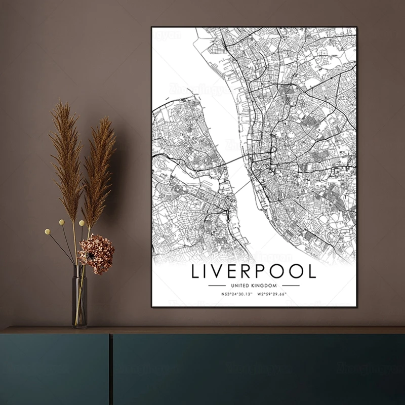 Черно-белая карта города, Великобритания, Ливерпуль, городская карта, плакат, HD печать, настенное искусство, холст, скандинавский ландшафт, живопись для домашнего декора