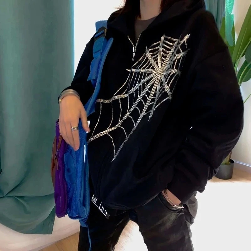 Стразы худи с паутиной застежкой Goth оверсайз Женская Осенняя Курт...