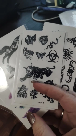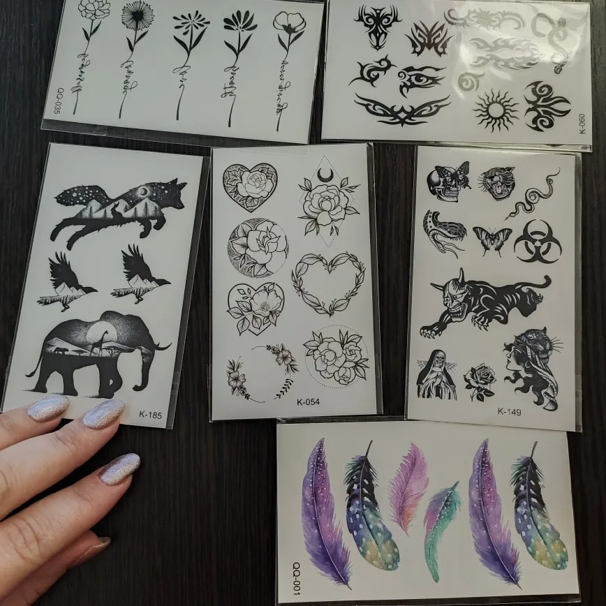 Доставка до Черноземья 3 недели. Упаковано нормально, заломов и складок нет, всё ровно и хорошо. Татуировка переводится легко, без усилий. Нужно снять защитную пленку, приложить на кожу, намочить салфеткой или губкой слой бумаги, подождать около 20-30 секунд. Затем аккуратно сдвинуть бумажный слой и дождаться пока высохнет татуировка, или можно высушить феном если не хотите ждать. Татуировка водостойкая, то есть можно купаться и плавать, можно принимать душ, но не тереть саму картинку. Держится в максимально ярком виде сутки, затем начинает мутнеть. К концу вторых суток уже не так красиво. При желании можно быстро удалить потерев салфеткой смоченной чем-то спиртосодержащим.