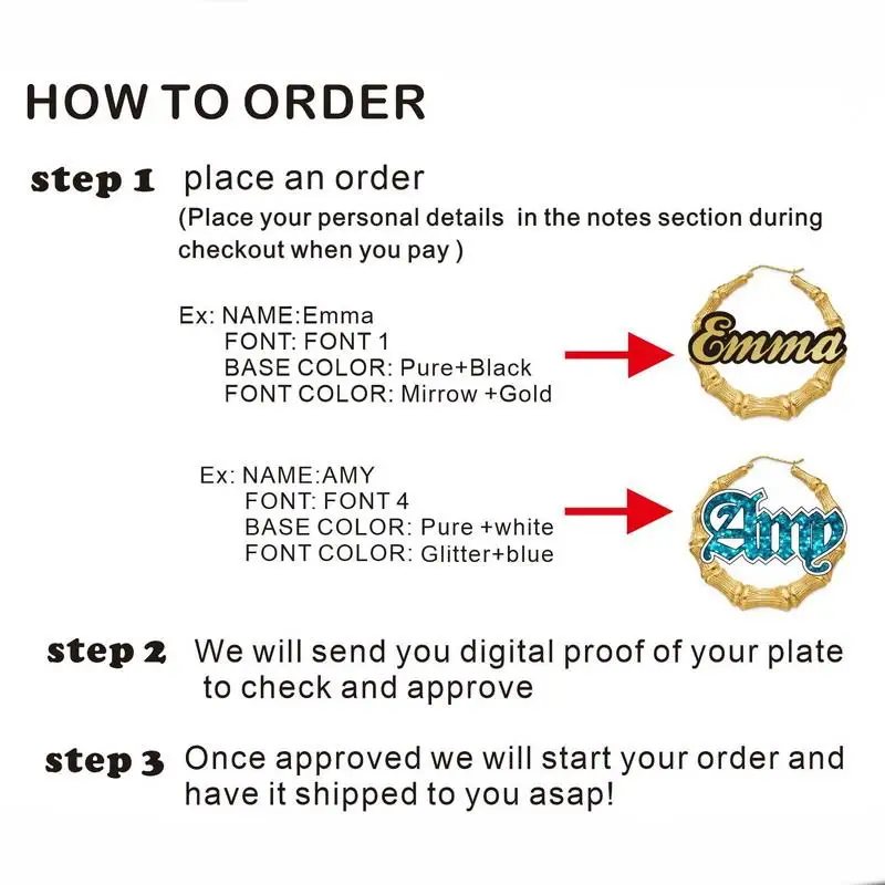 Уважаемый, когда вы покупаете ювелирные изделия, вы должны оставить сообщение после заказа или отправить мне имя и шрифт, который вы хотите настроить (например, имя: Rosmary, font2). Если вы забудете, я буду ждать 48 часов. Если вы не ответили, мы будем использовать шрифт по умолчанию, чтобы сделать ваш заказ.