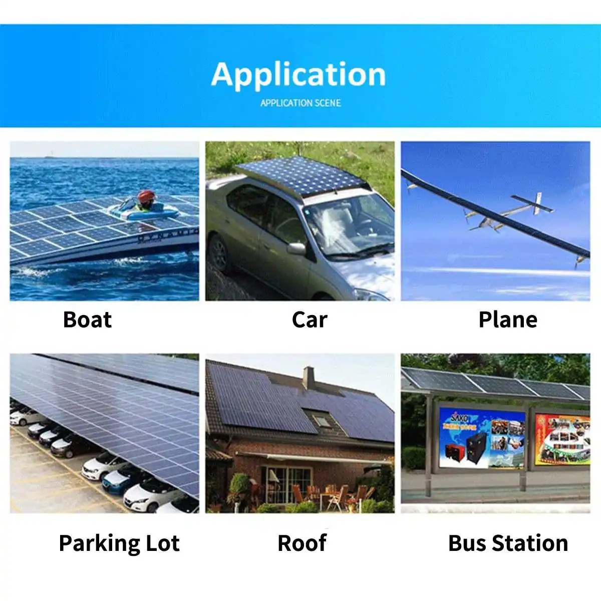 ● Гибкие солнечные панели (500 Вт)-Высокая мощность, подходит для улицы и RV-- Эва (этиленвинилацетат) + PET защитная плёнка для переднего панель, гибкий, светильник и прочный, светильник вес-Эффективность монокристаллических кремниевых солнечных элементов достигает 20-24%.-- 4x люверсов более удобны в установке.-Водонепроницаемый IP65 класс, подходит для использования на открытом воздухе под дождем. Светильник-Подходит для кемперов, лодок, домов, садов, сараев или ферм