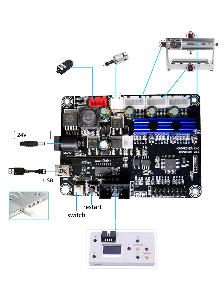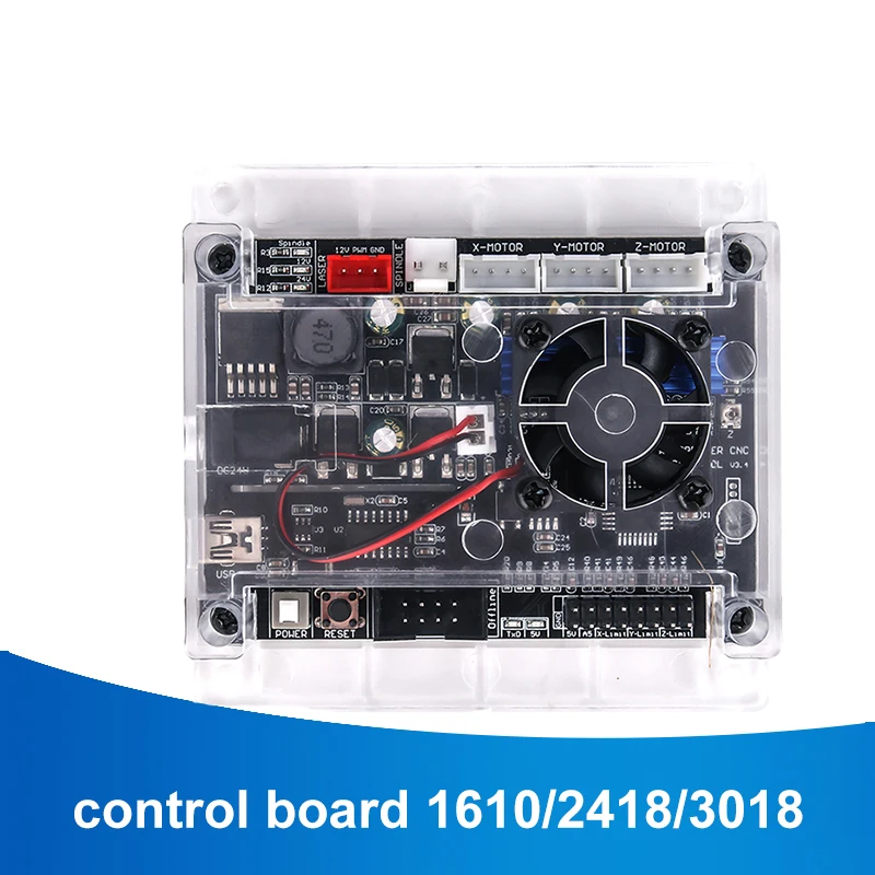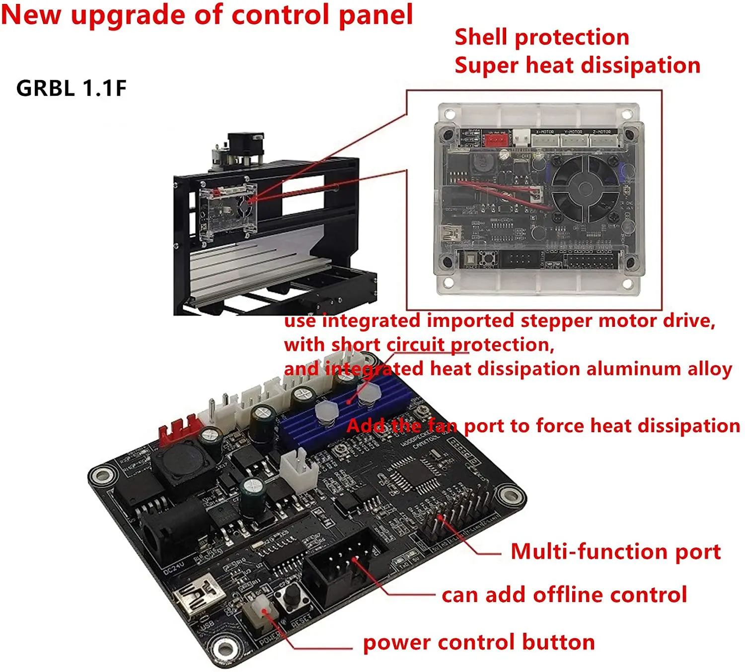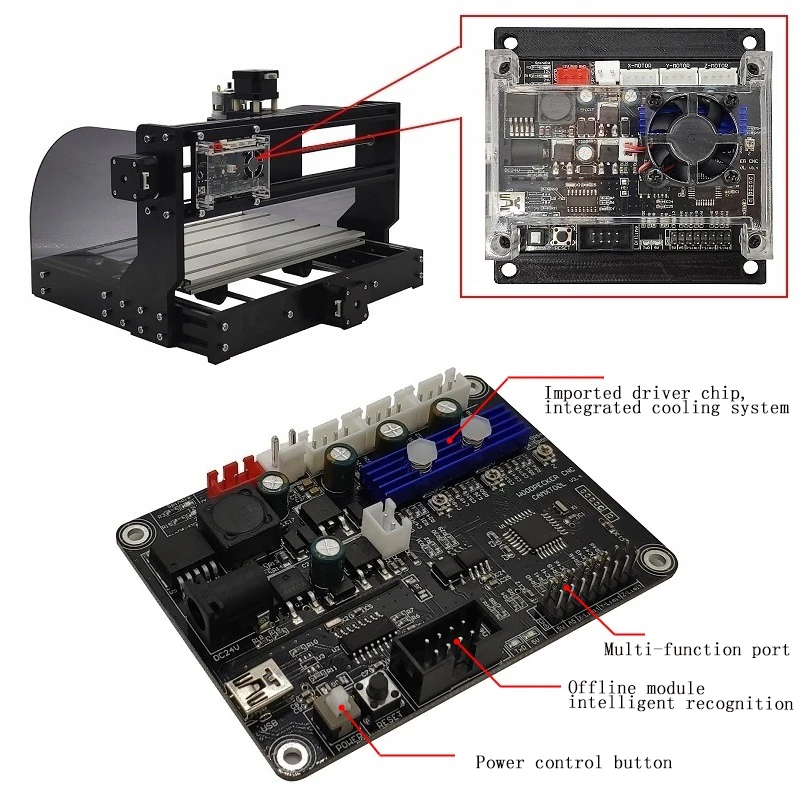 Добавить внешний корпус: главным образом для голой платы управления, короткого замыкания проблема во время использованияДобавьте переключатель кнопки питания (этот переключатель является сигналом управления источником питания, нет большого тока, проходящего через выключатель, не беспокойтесь о размере переключателя)Отменить модуль привода, интегрированный импортный шаговый двигатель, с защитой от короткого замыкания, не нужно беспокоиться о повреждении модуля. И интегрированный теплоотвод из алюминиевого сплаваДобавьте вентилятор для отвода тепла.Добавьте распознавание в автономном режиме для одновременной вставки автономных модулей и компьютеров. Автономный режим автоматически определяет, есть ли компьютерный контроль.Улучшенный привод шпинделя. Может поддерживать шпиндель 20000 об/мин. Поддержка больших мощных шпинделей