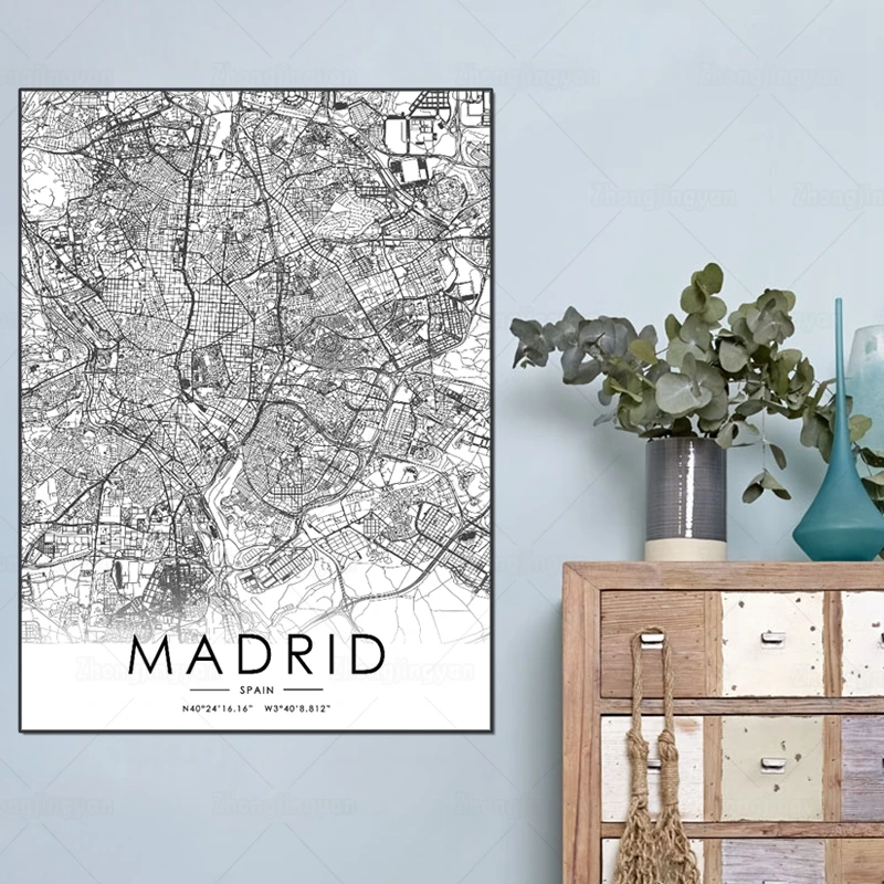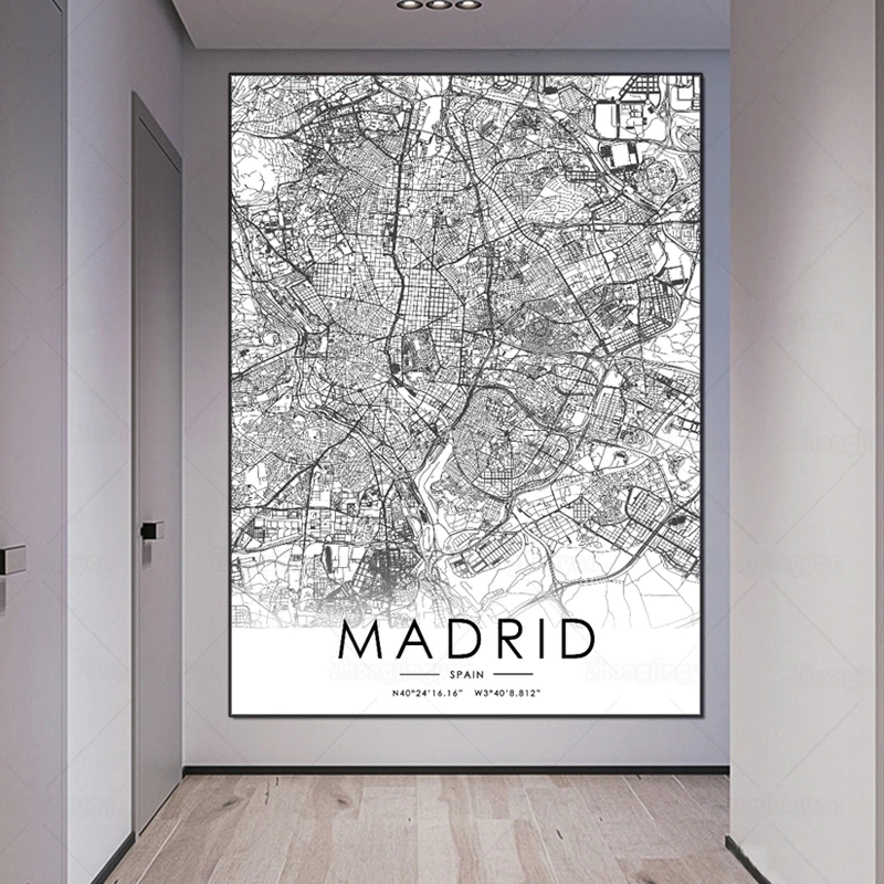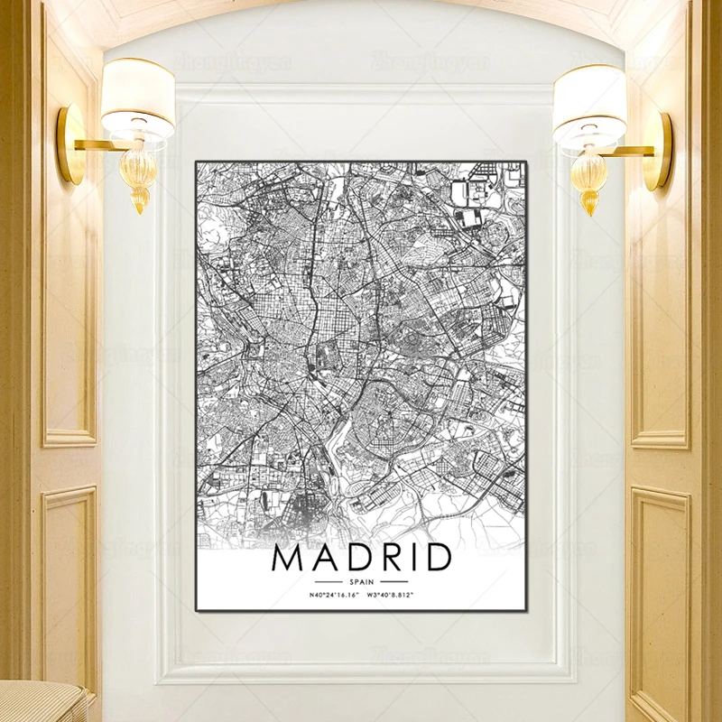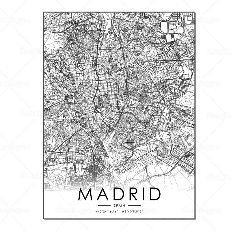 Плакат с изображением черно-белого города, Испании, страны, Мадрида, HD-печать, настенное искусство, холст, Скандинавская картина Landspace для домашнего декора